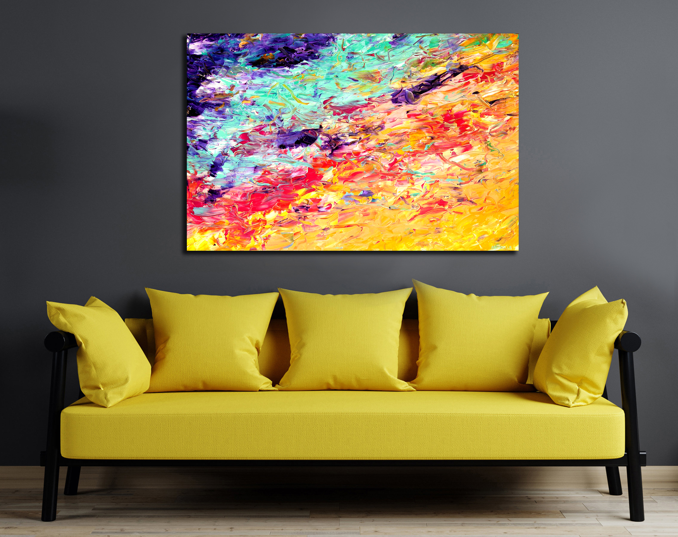 This canvas has the dimensions is 116 cm in width by 76 cm in height. The sides are painted white, so a frame is not required.