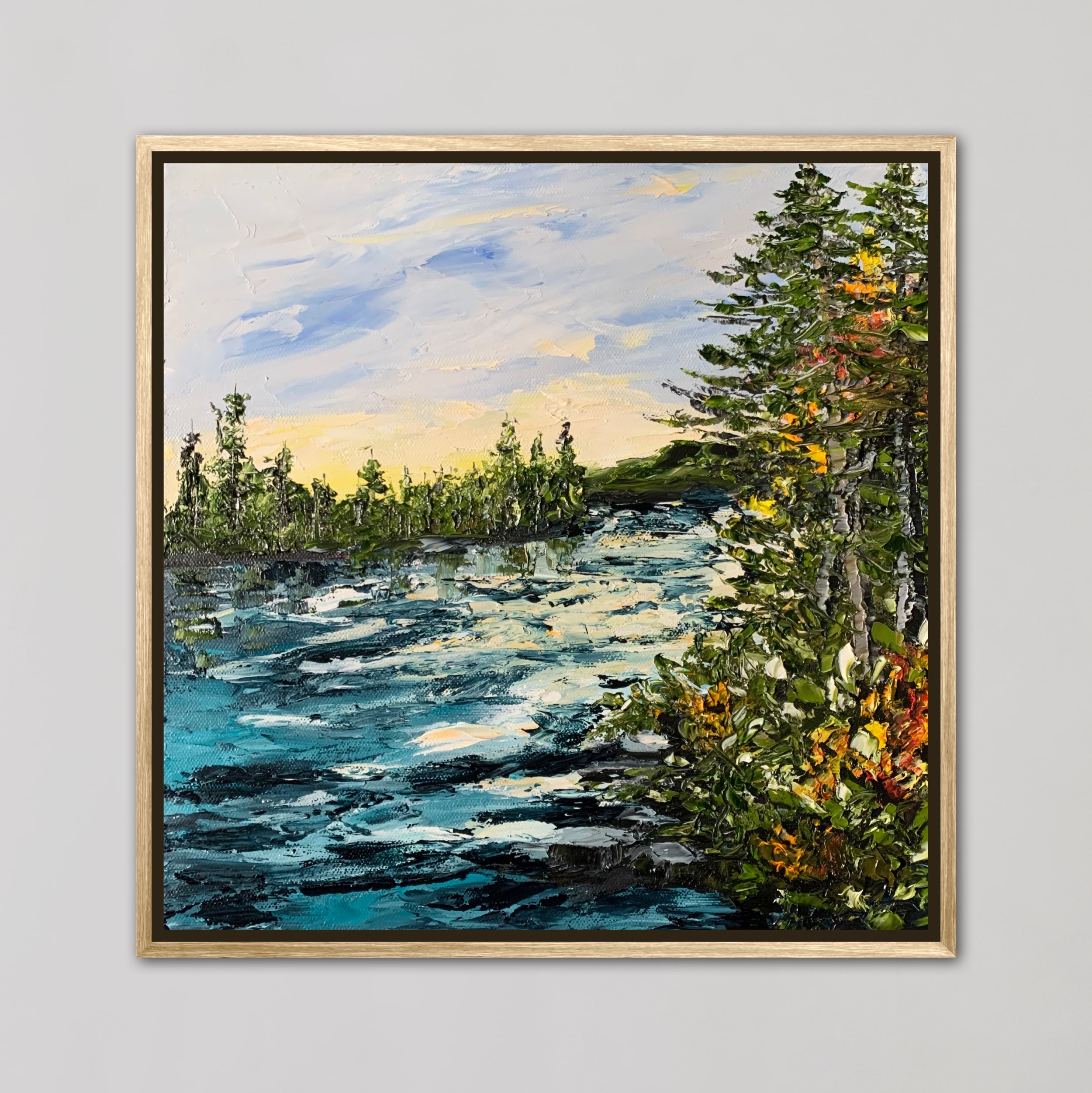 This heavy textured artwork is made using impasto technique with palette knife and is framed in natural timber floater frame, ready to hang.