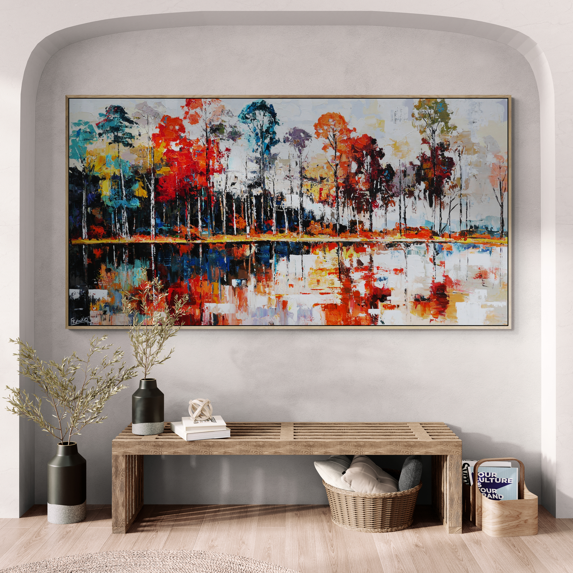 Provided with listings are some insitu images. We strive to ensure they are accurate in scale. Sometimes we will add an external frame to the painting insitu, to provide a vibe for how that would look also. As mentioned above, my pieces arrive ready to install with gallery finished edges and honestly, most people don’t add external framing. However, it is of course an option. If you have any questions, please let me know. We are here to help and want to make it as easy as possible for you if your décor aspirations require it.