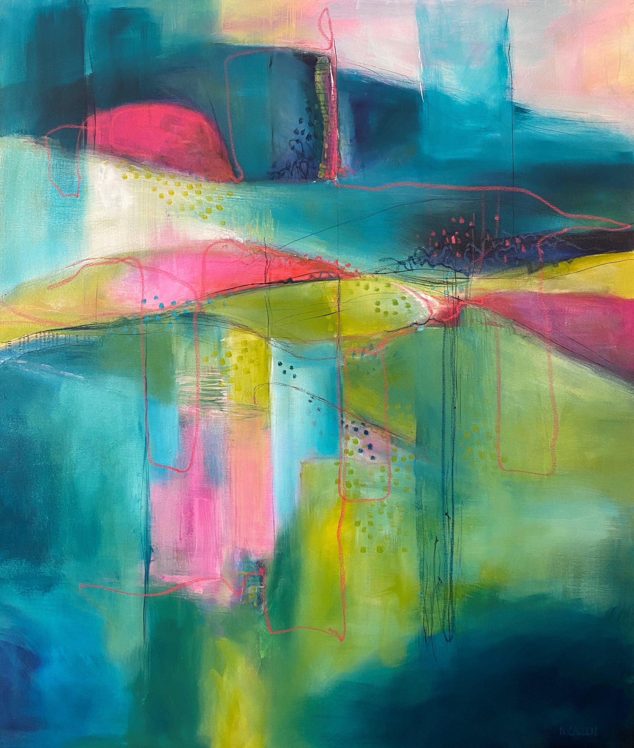 Lakeside by Narelle Callen is a contemporary landscape of rolling hills, open space and vistas toward distant hills and a city.  The foreground shows a reflective lake.  The painting is full of energy, bright colours and pastels.