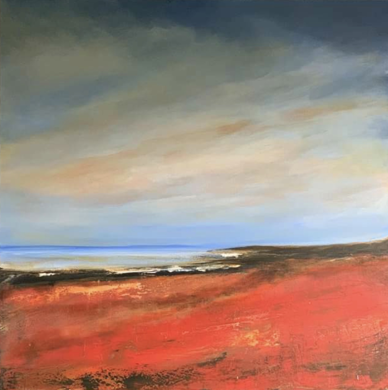Our Great Southern Land or the Land Down Under…… as Australia is known with its varied landscapes offering a kaleidoscope of stunning colours from the pristine blue of the coastline to the bold rich colours of the red centre. ‘Land down under’ aims to capture some of these colours in the red gold, ultramarine blue, yellow ochre and titanium white used throughout.