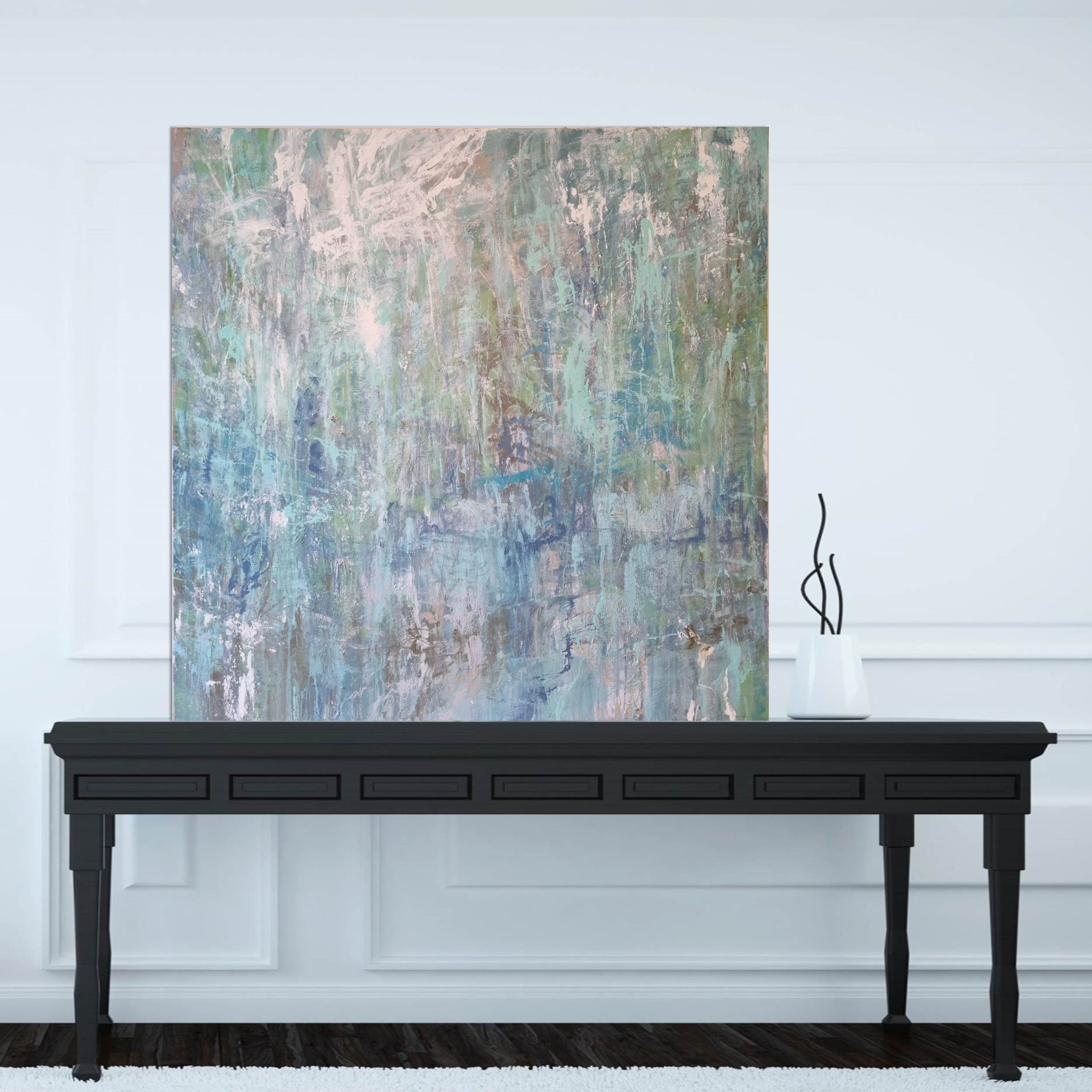 This painting is finished with a modern soft satin protective finish and matte white edges. It’s feel within a room is dynamic and decorative, yet holds a grounding and calming effect, sure to make an appealing feature, at home equally in a domestic interior or corporate space.