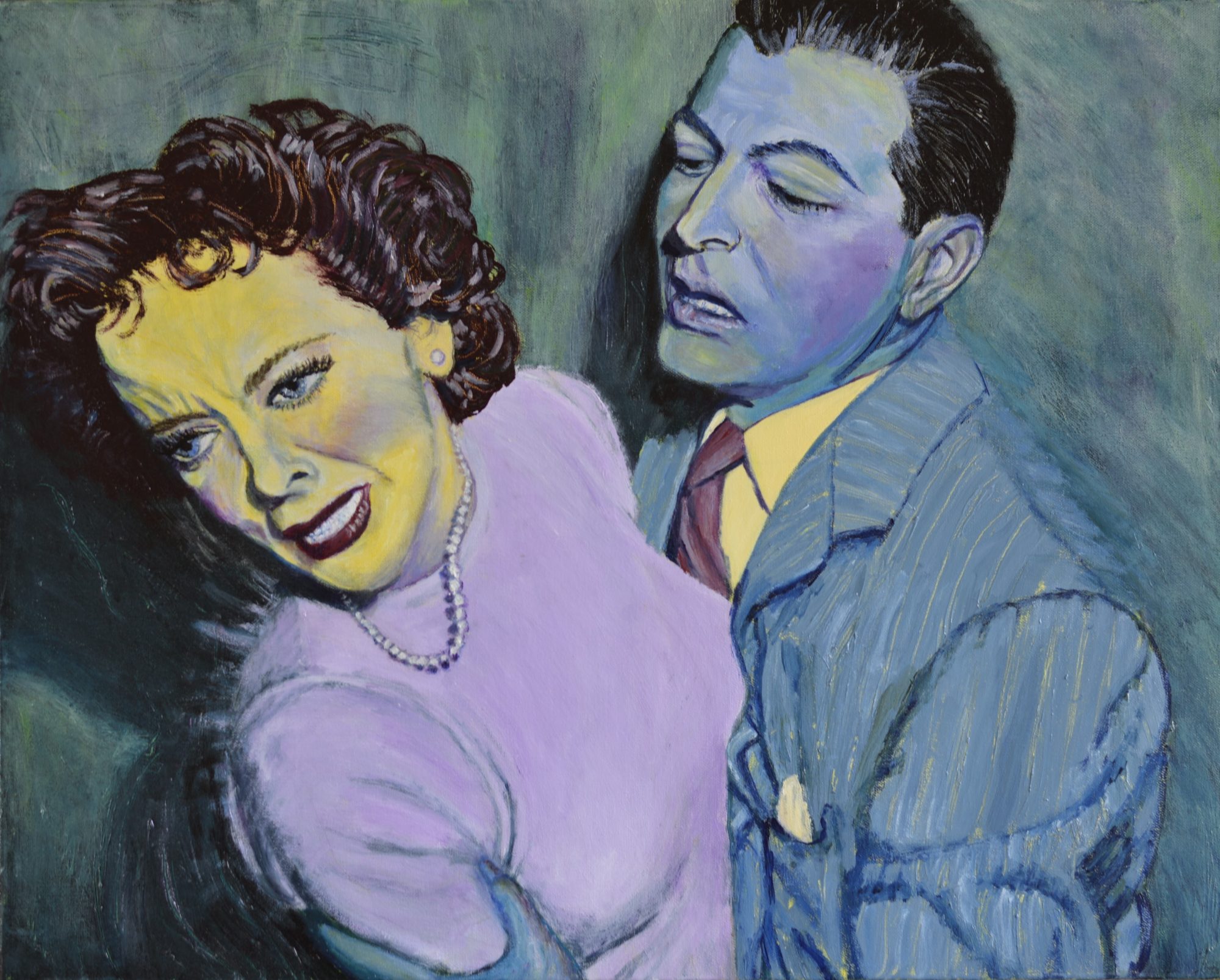 Original expressionist film noir 1940s retro Hollywood painting on high quality stretched canvas ready-to-hang with d-rings and picture wire. The inspiration for my paintings is the glamour and drama of Hollywood movies of the 1940s and 50s. These movies often used expressionist lighting and camera shots. I appropriate and transform the black and white publicity stills from the films by painting them in arbitrary colours. My paintings are created using acrylic paints, gels and mediums and often have interesting textures and a glossy or metallic surfaces. Landlord is a painting of Ida Lupino, a Hollywood film noir star of the 1940s. Ready-to-hang with d-rings and picture wire.