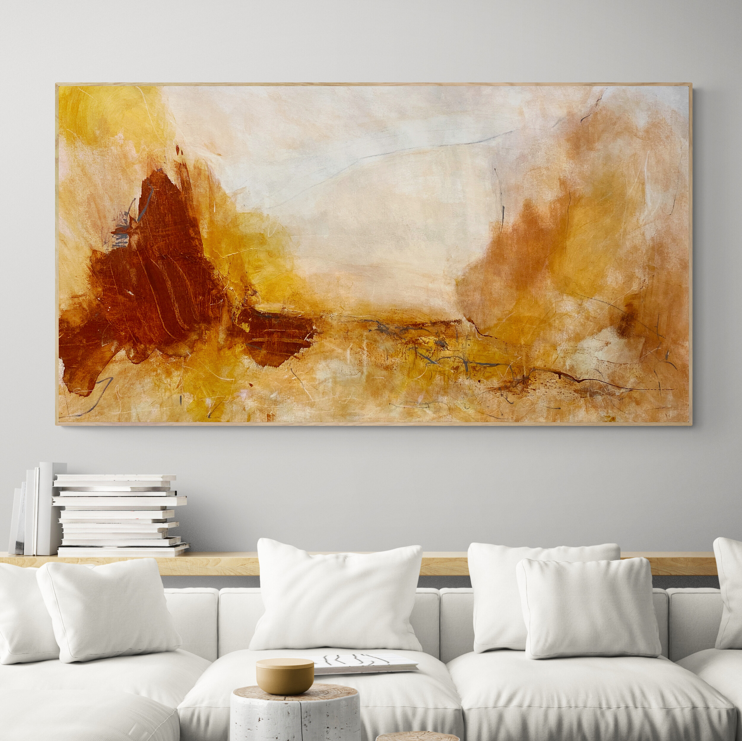 Landmarks is a beautiful earthy framed statement painting perfect for any space. The combination of the delicate mark making and restful palette of light warm beige, tan ochre, rust and white with touches of dark grey makes this stunning piece come alive.