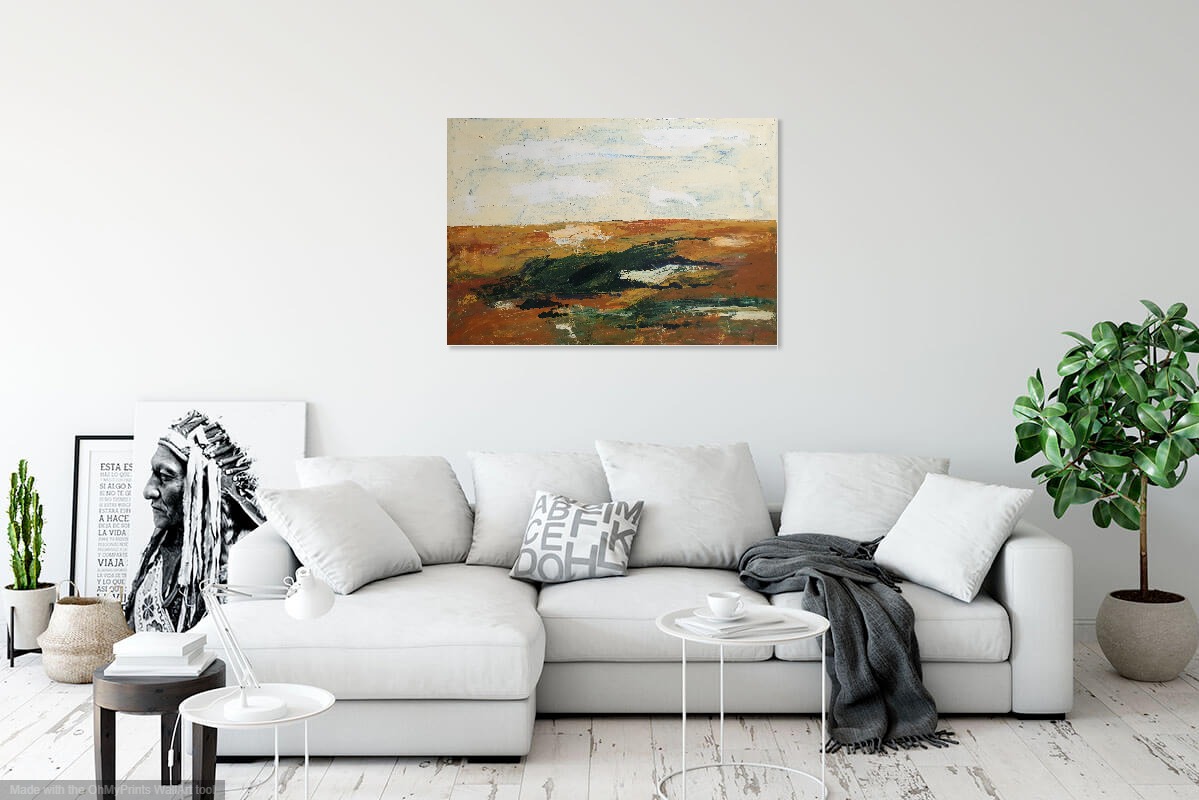 Landscape by Olga Megele. This landscape contains beautiful, multiple layers of texture and colour. Truly more impressive in real life. It glows with rich ochres, sienna and greens. Broad confident strokes of the palette knife are evident. A stunning piece.