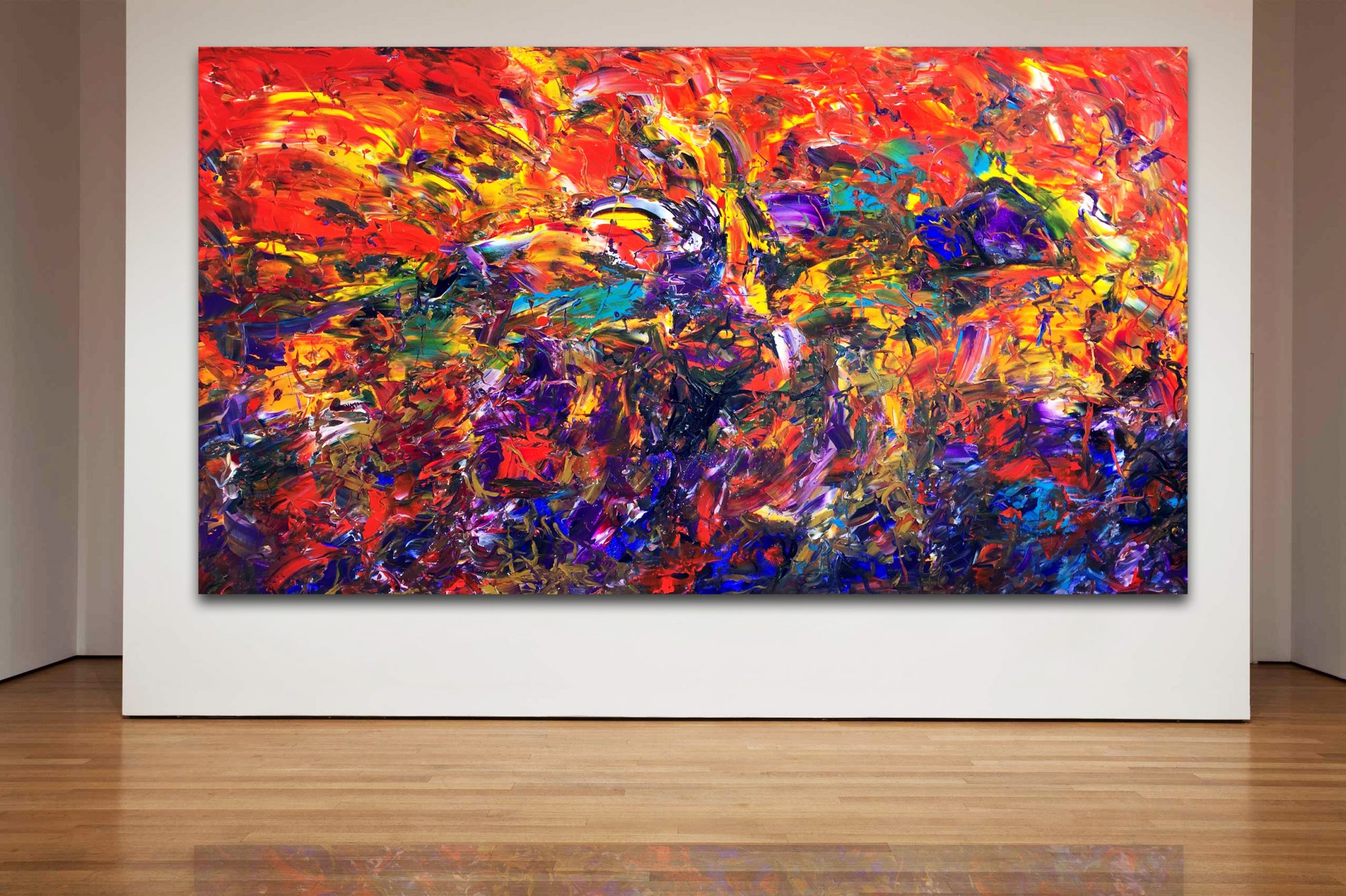 This work explores the emotion of a vibrant landscape at dusk, the colours and feeling of a sense of perfection that seems to take a life of itself. It is an exploration of abstractionism and painted in the style of abstract expressionism.