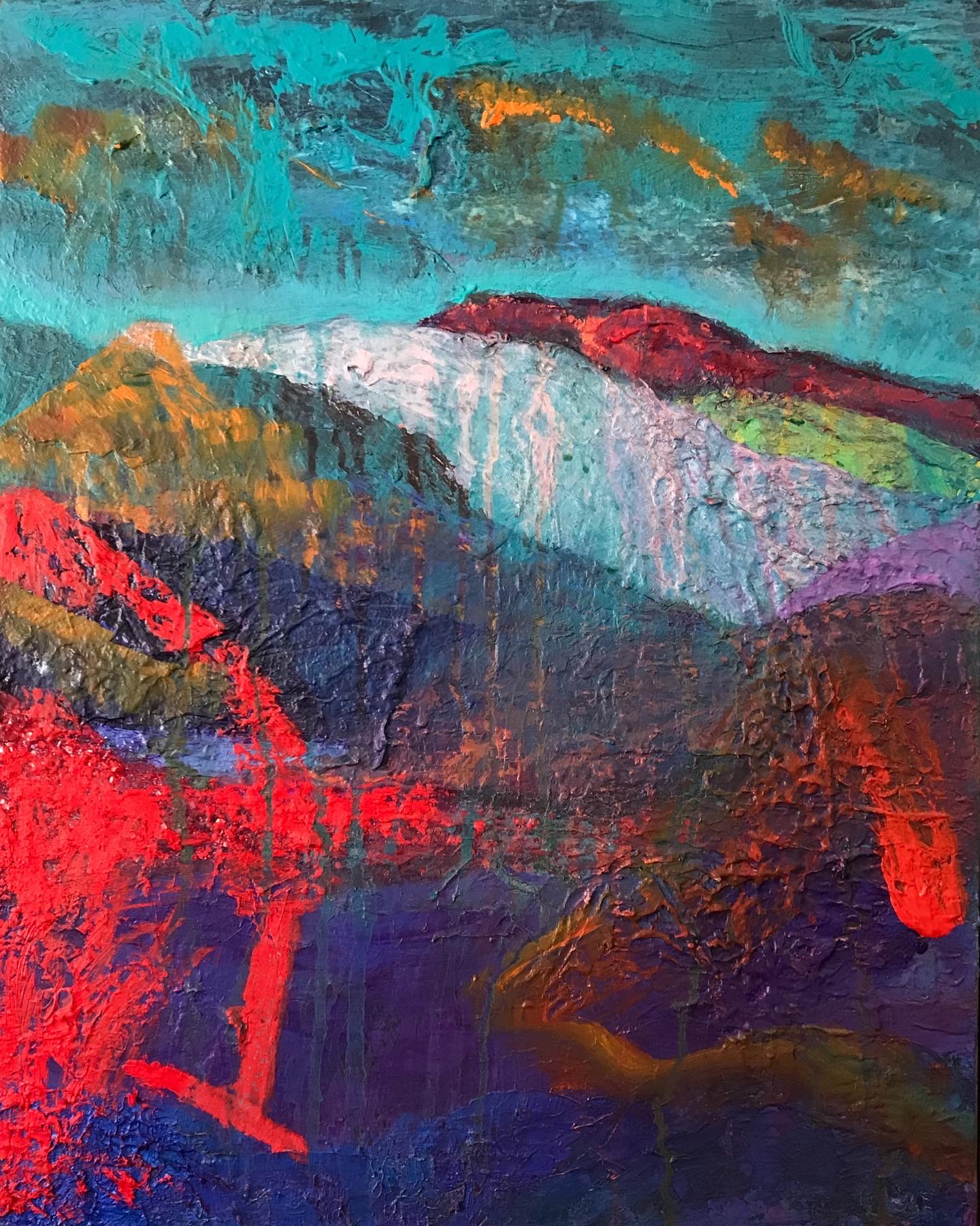 This painting has finally come to fruition being a little smaller than my usual canvas size. The weaving of overlapping, abstracted hills and colour relationships dominate this work from top to bottom. I hope to spread some joy with this painting in my use of saturated colours contrasting with more subtle hues coupled with a semi abstract landscape vibe.