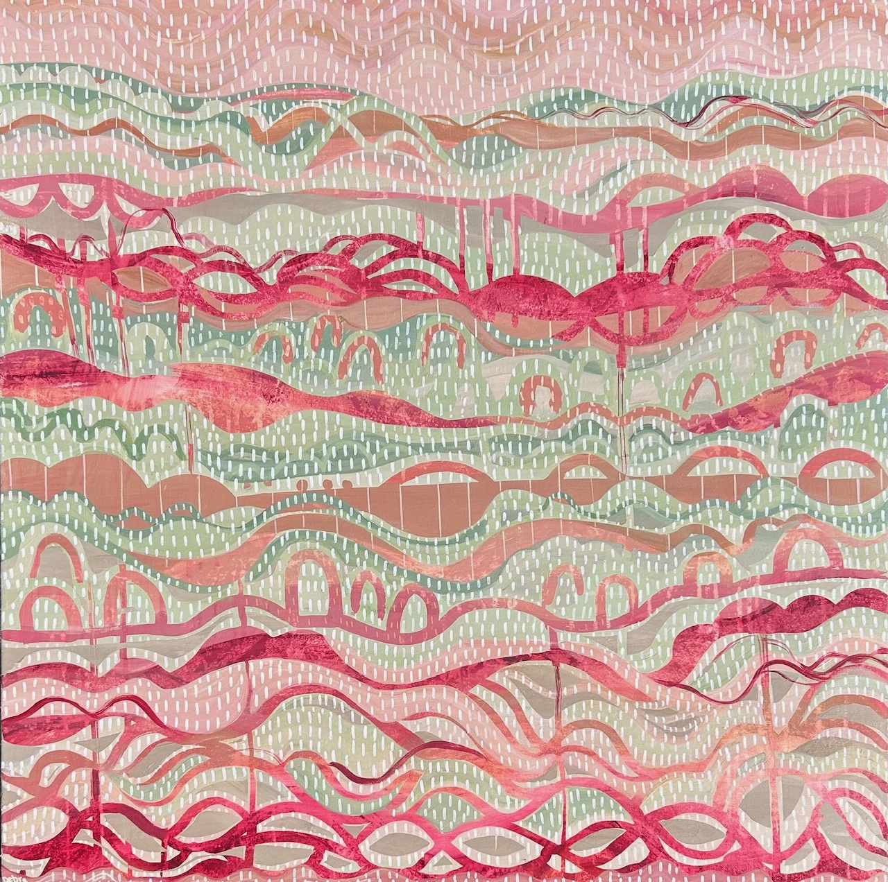 This artwork is an abstract style landscape using the contrasting textures and patterns of acrylic paint and artist markers. I am inspired by the patterns of earth, water and sky and ‘Landscape Serenade’ features many layers that I weaved throughout using organic inspired shapes, repetitive patterns and contours with a sense of harmony and flow. My focus came from of one particular colour; permanent brown madder that I used as a starting point then the rest of this earthy colour palette evolved around it. This artwork is deep and rich with punches of colour that is balanced with softer, calming elements, perfect for a stunning feature for any space and an oak frame would look beautiful.