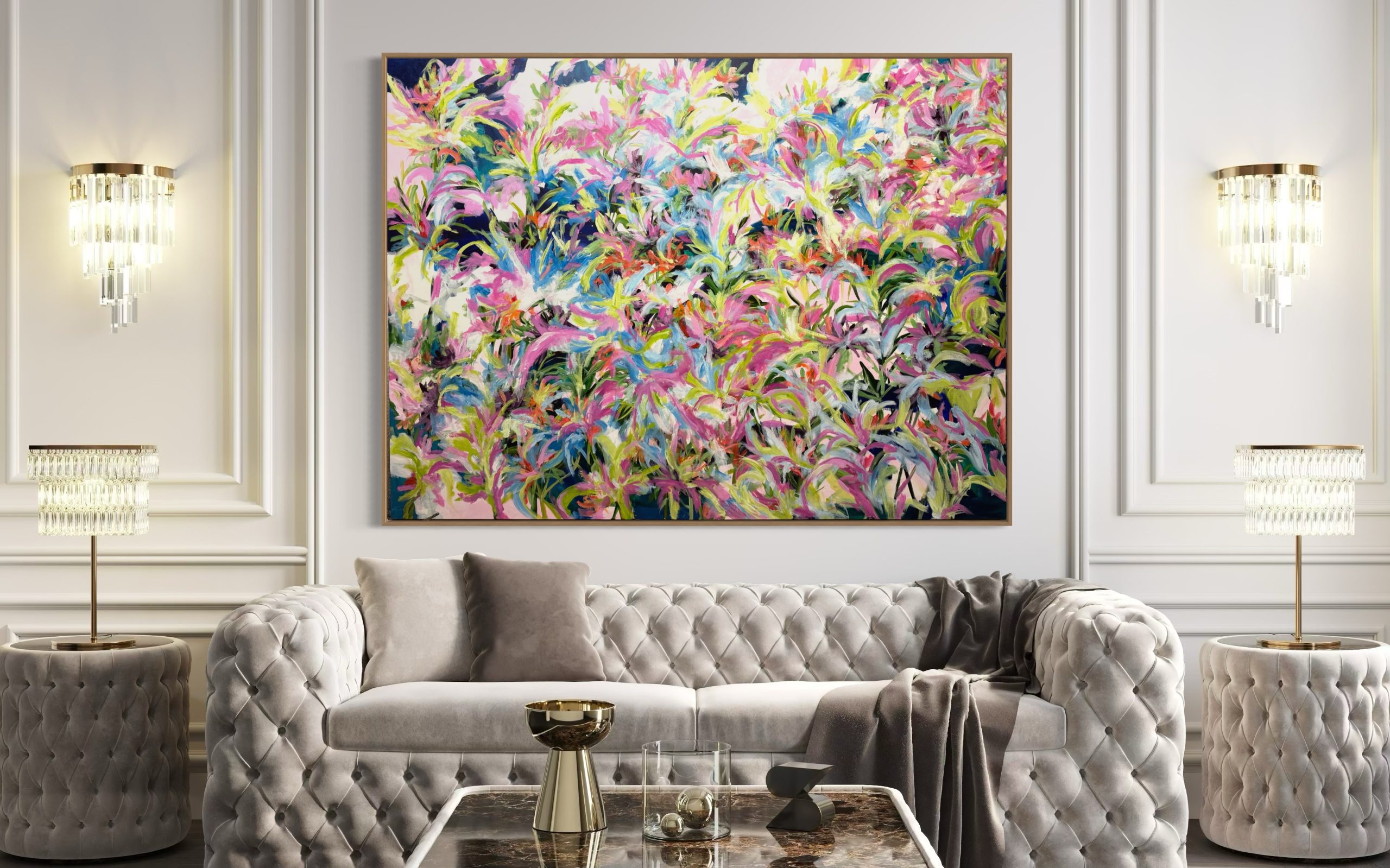 The artwork is a dynamic, multi-layered composition, with swirling, overlapping brushstrokes that evoke the vibrancy of a garden in full bloom. Vivid hues of fuchsia, golden yellow, rich purples, and soft blues blend together in a fluid dance of color, creating a sense of movement and life. Intuitive, organic shapes emerge from the chaos—soft, petal-like forms mingle with bursts of leafy greens, while dappled streaks of white suggest the shimmer of sunlight filtering through foliage. The brushstrokes are bold and textured, some thick and impasto, while others are delicate and feathered, enhancing the illusion of depth. The layers of color seem to pulse with energy, drawing the viewer’s eye across the canvas as if moving through an ever-changing, abstract garden. Despite the lack of defined forms, the piece conveys a sense of natural growth, the interplay of light and shadow, and the fluidity of time in a blooming garden.