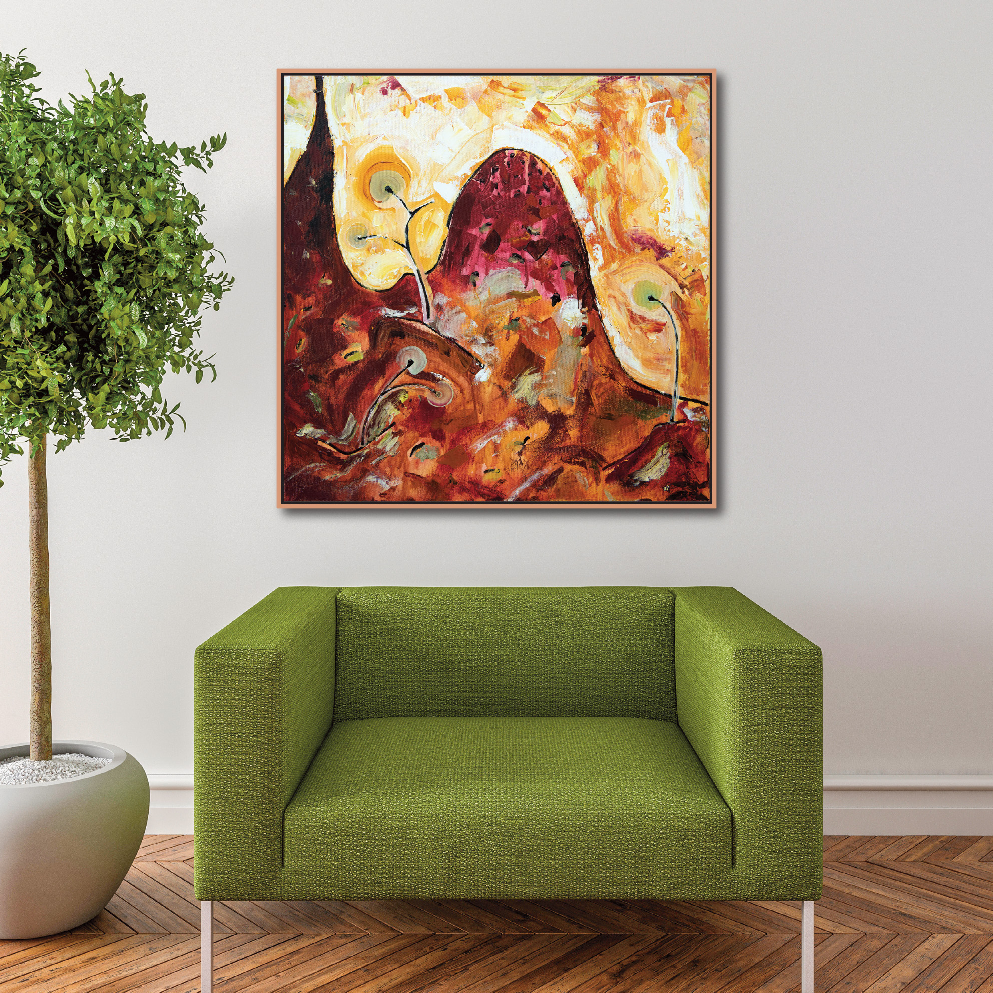 Larapinta 2 by Michael Wolfe – 64x64cm framed in a thin line Mountain Ash frame in a Teak and natural Danish Oil finish.