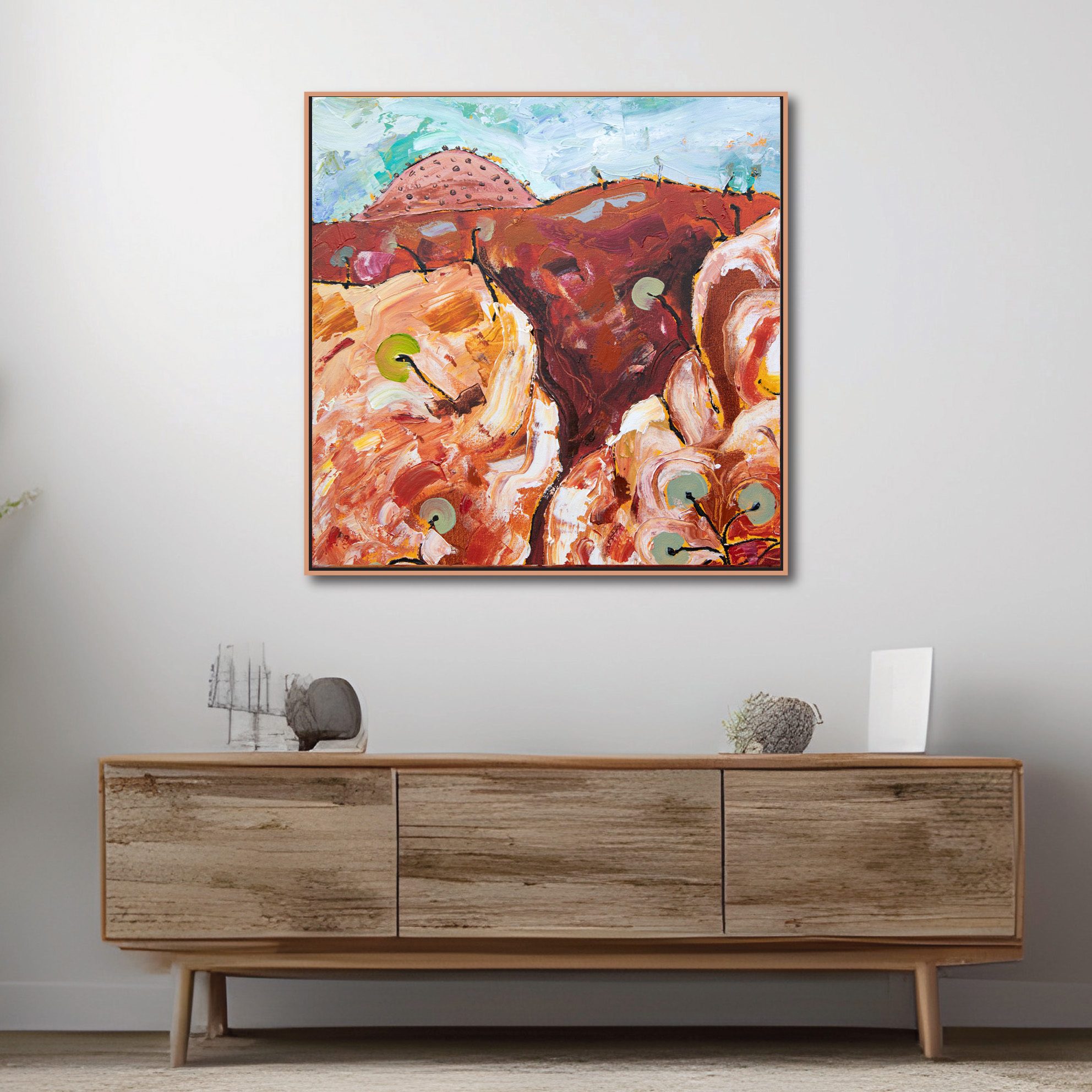 Larapinta 7 by Michael Wolfe – 64x64cm framed in a thin line Mountain Ash frame in a Japan Black and natural Danish Oil finish.