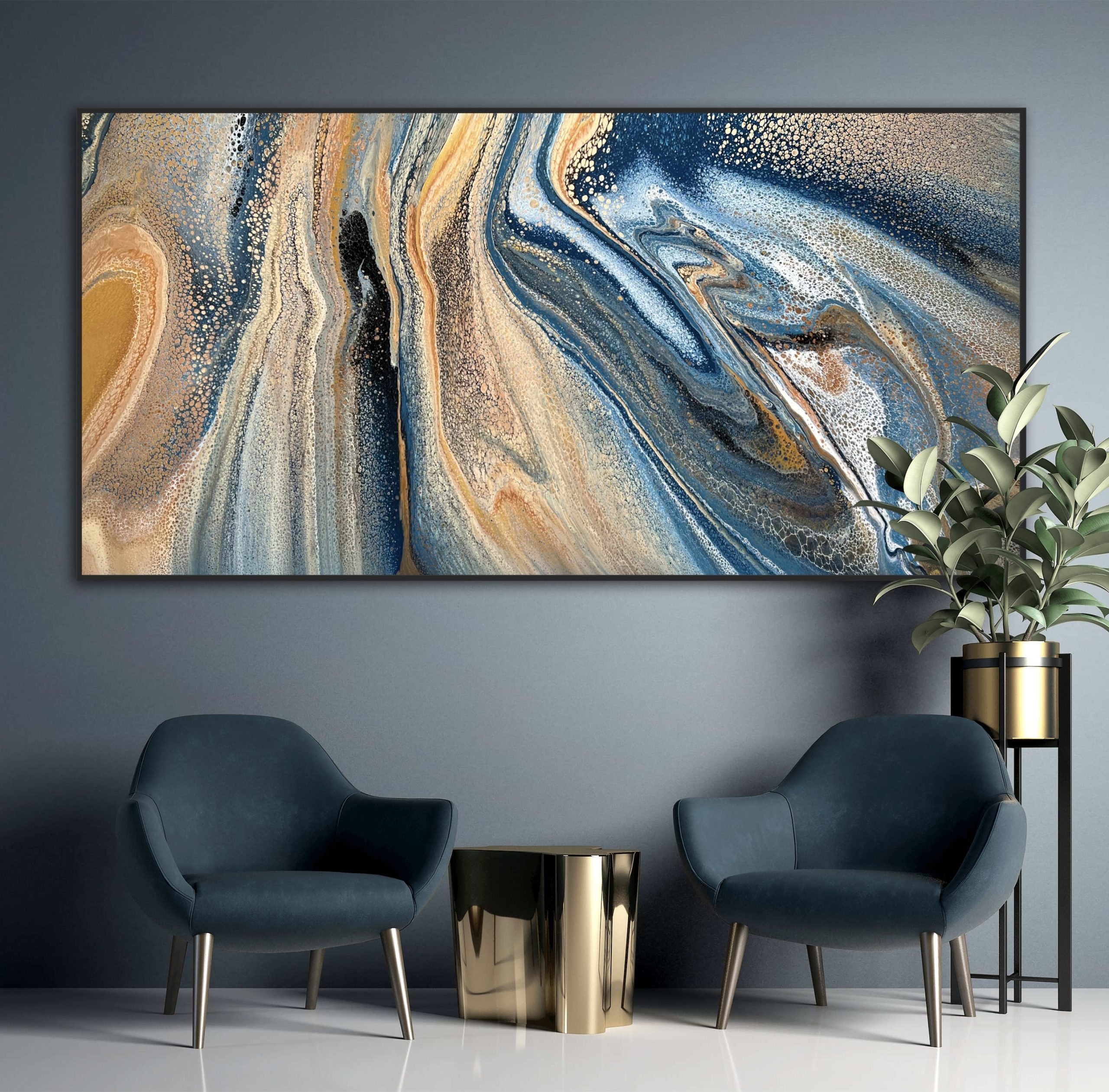 Last Light was created using various techniques combined to allow increased flow, interaction and separation of colours to create interesting patterns where pops of colour can be seen emerging from underneath. This added dimension adds lace and cells to the artwork creating an interesting and one of a kind painting that can never be replicated. A gorgeous variety acrylic pigments were used including metallic yellow & rose gold, blush, bronze, silver, cream, grey, a variety of blues, black and white.