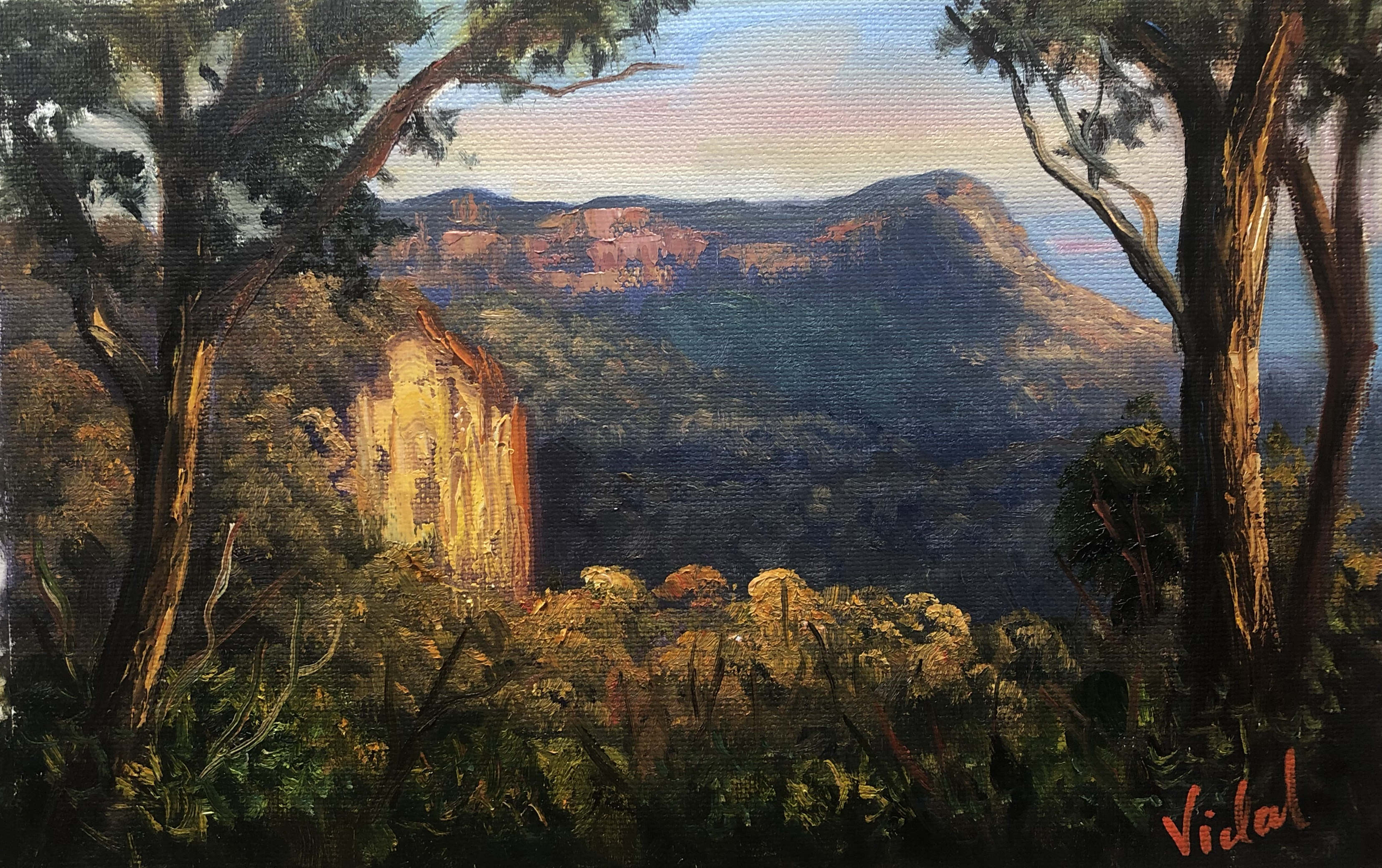 Title:Â Last light on Narrow Neck, Blue Mountains – oil on loose linen