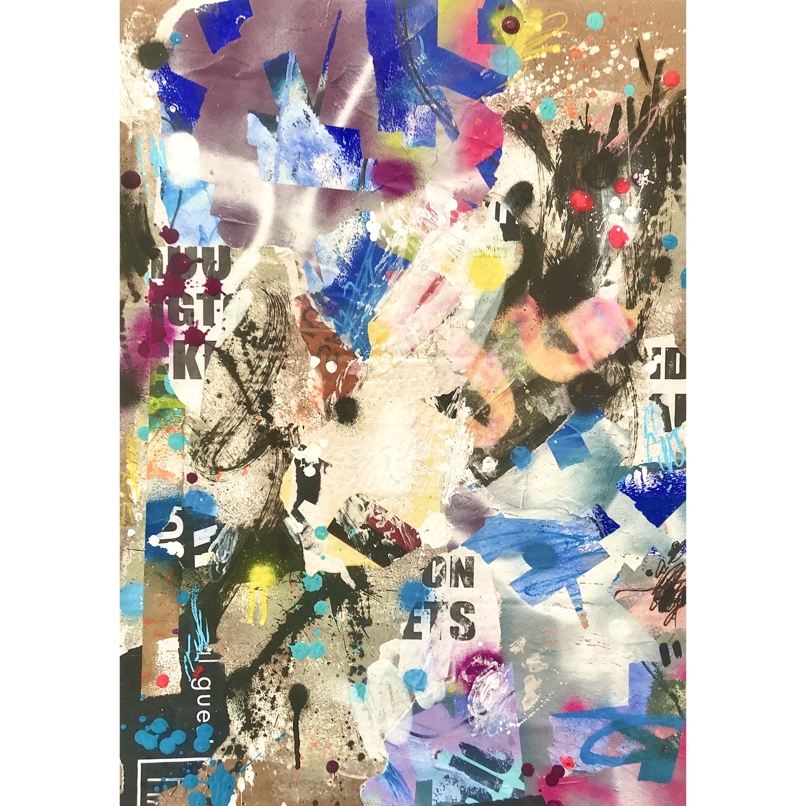 This artwork has a textured finish created by built up layers, paint splatters and torn paper, a visual effect mimicking the look you would see in the street where this effect is created over time on Graffiti Walls & Advertising Spaces. These imperfections are part of the overall look and feel of the finished work.