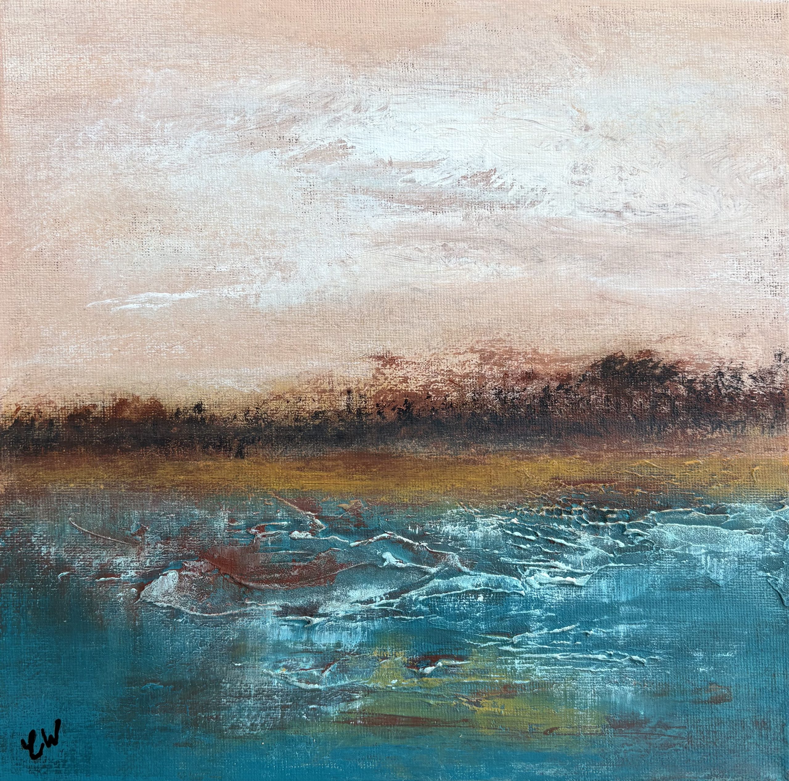 This piece is a beautifully textured abstract landscape/seascape. 25 x 25 cm. Ready to hang, frame not included.