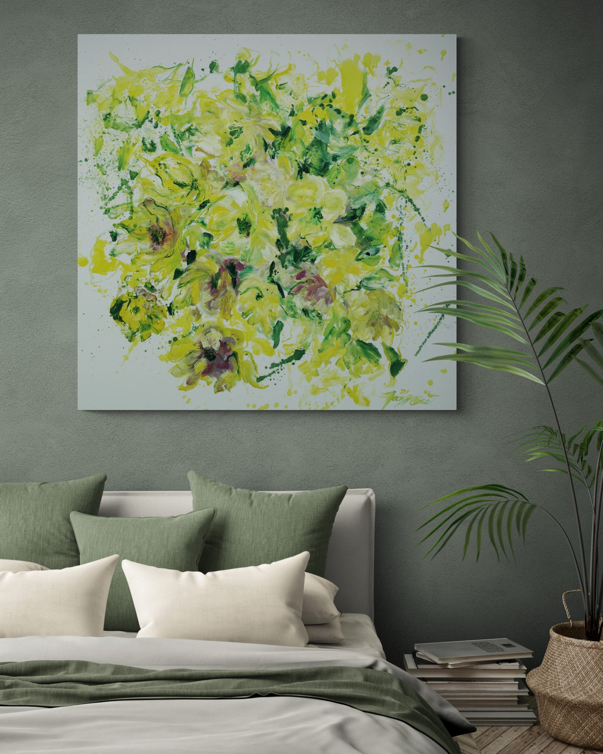 In late summer, the afternoon sun is very bright but gentle, when I was drawing the picture, the thought of this kind of light, like the power of the idol, large areas of dazzling yellow, purple Again like a gentle mother colour, light to cross the green of the earth, we deeply affects the land. signed on the front. Oil on museum grade canvas.