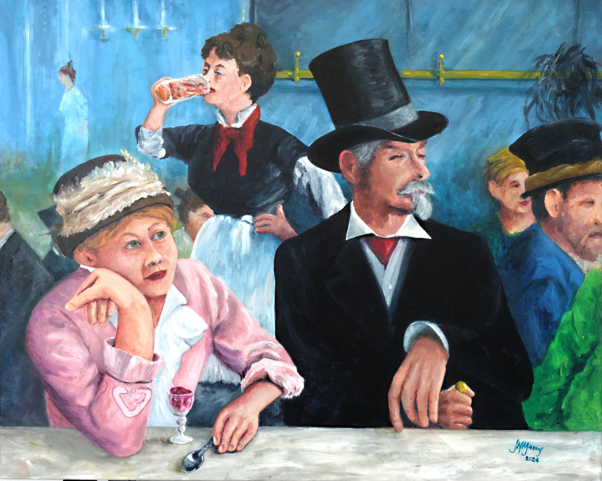 An adaption of two of Édouard Manet’s paintings. 1875 Scene set in the Cabaret de Reichshoffen on the Boulevard Rochechouart, where women on the fringes of society freely intermingled with well-heeled gentlemen. Later that night the plum eater turned up at the cafe.