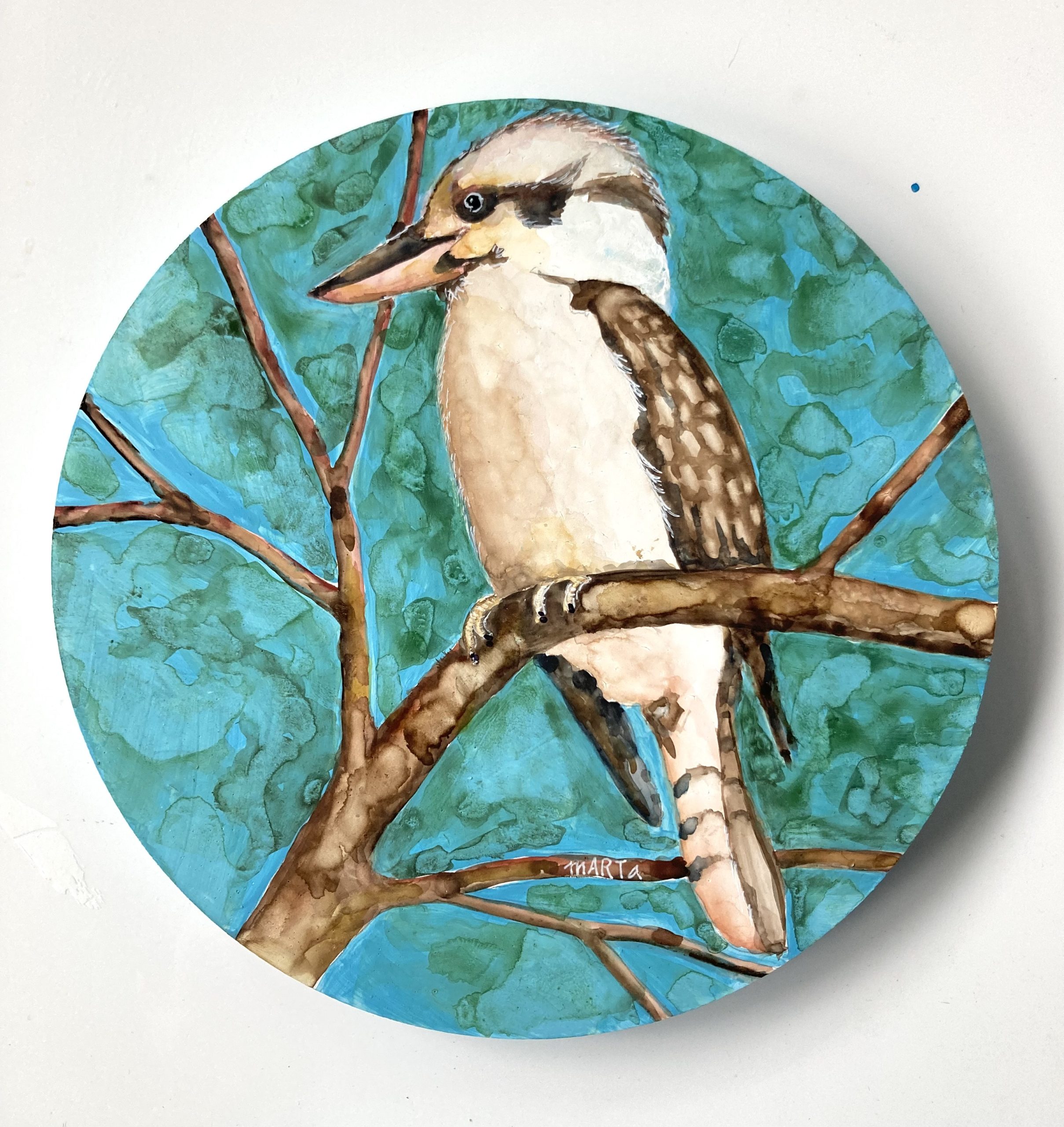 ‘Laugh Kookaburra Laugh’ is mixed media of acrylic and watercolour on a 17cm round composite disc. It has been protected with three layers of gloss varnish to bring out the bright colours. It can be displayed free standing and also has a hanging wire across the back. A small display easel is also provided for displaying it on a shelf.