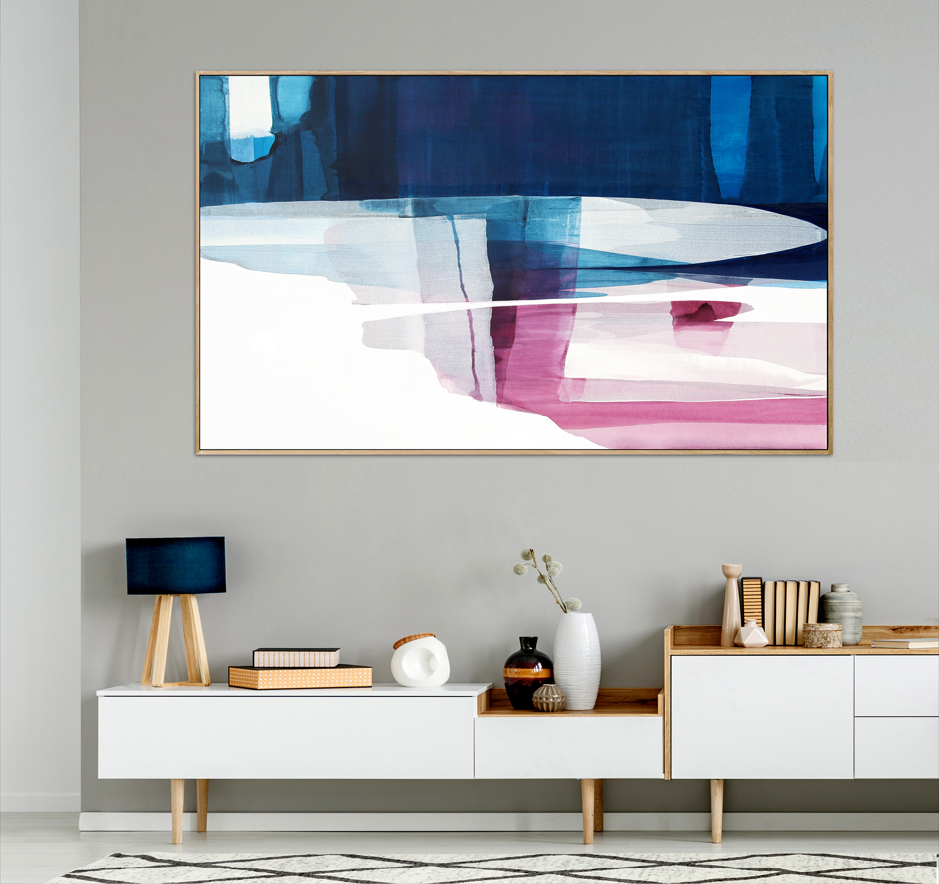 The painting wraps around the 3.8cm sides of the frame so it’s ready to hang. The first image shows a framing suggestion. A quote for a floating frame can be provided.