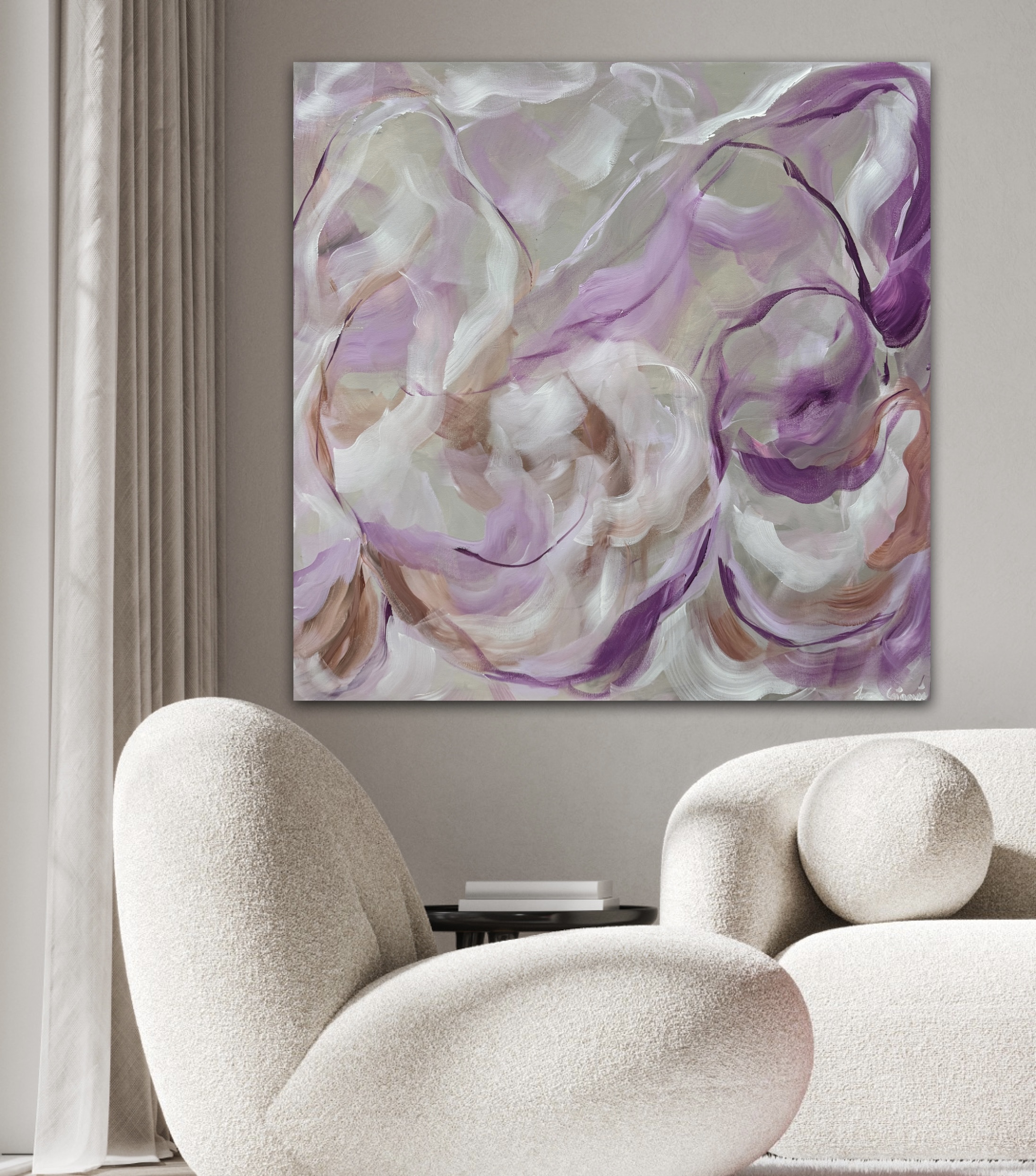 ‘Lavender Haze’ has a soft, dreamy feel with flowing brushstrokes and a colour palette of lavender, mauve, and shades of beige. The movement within the piece gives it a sense of elegance and calm, reminiscent of delicate petals or swirling clouds.