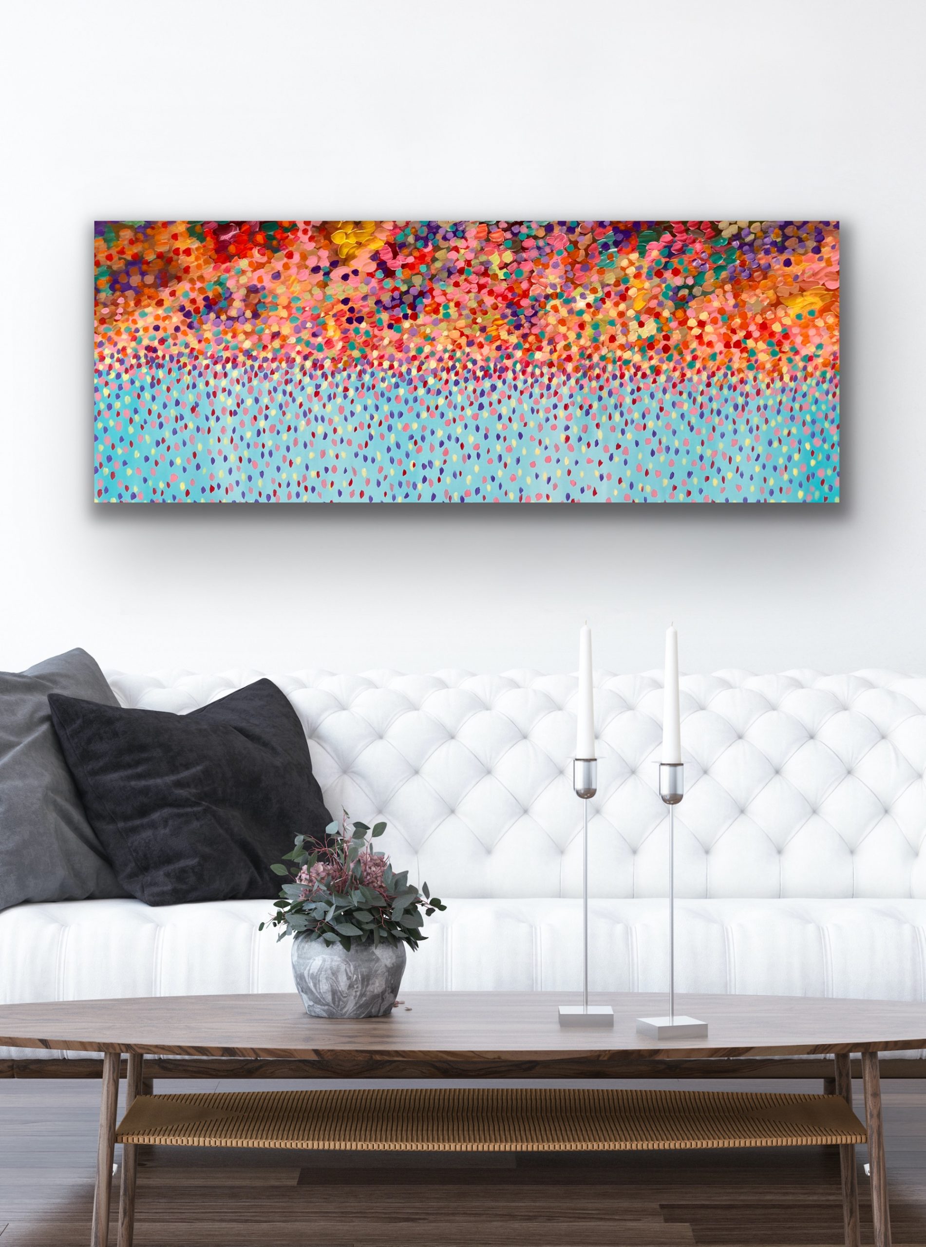 A beautiful rainbow of petals falling onto the landscape creating fireworks of petals in the sky. Petals like musical notes dancing to their own song creating their own rainbow of Love. Beautiful lavender colour petals weeping in the sky. Hope with this work it makes the viewer feel very peaceful and tranquil. I tried to create so much depth in the painting with a beautiful blue sky . The painting is signed and dated 2021 at the back and comes with a certificate of Authenticity.