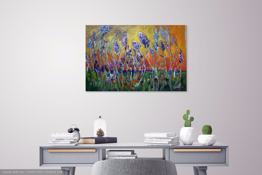 Original oil painting by Maureen Finck. This lavender flower painting was inspired by the row of lavender growing against my orange side wall.