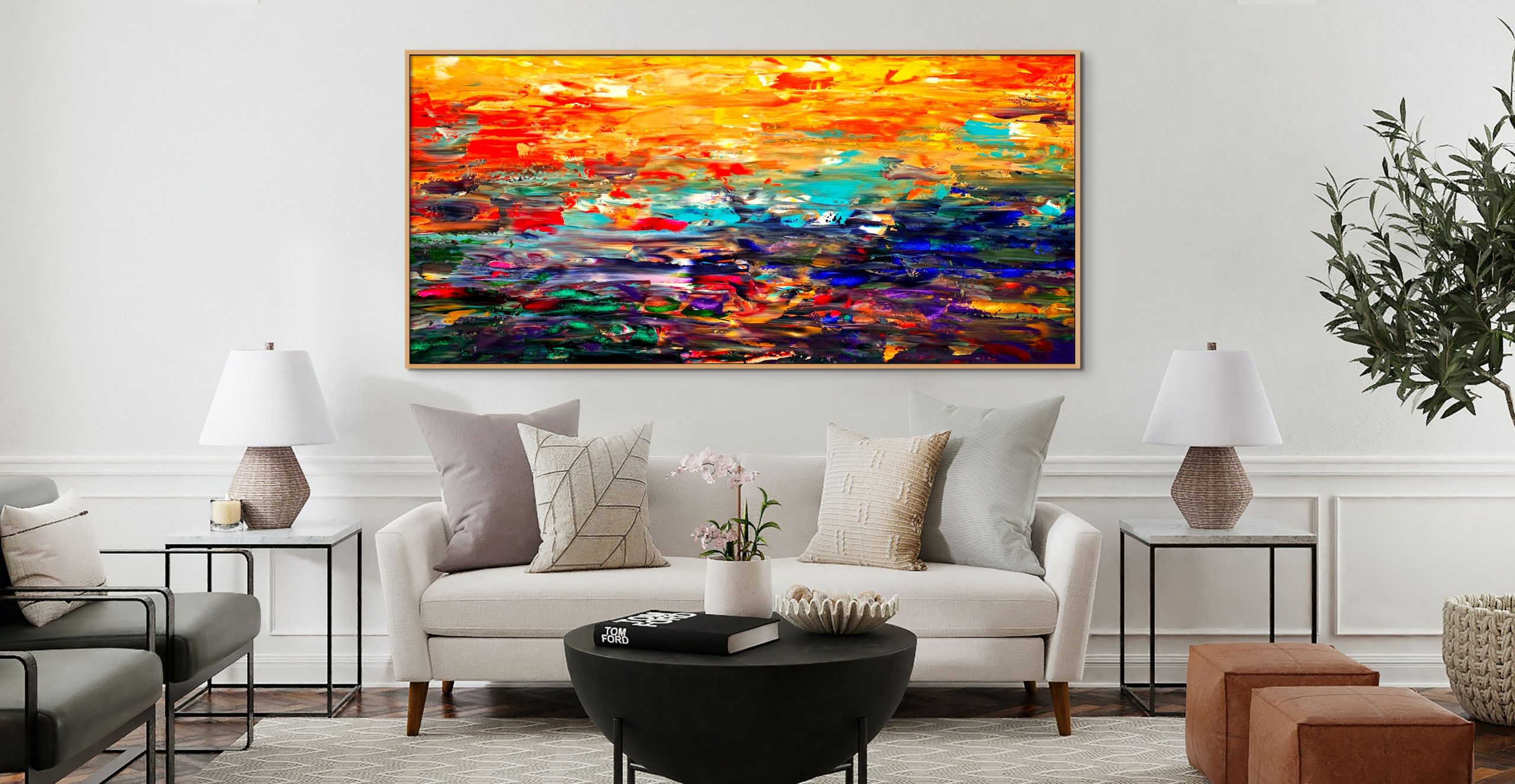 This artwork is painted on professional-grade canvas stretched and sealed with varnish. The canvas has dimensions 226 cm in width by 125 cm in height. The painting wraps around the sides of the stretcher, so the sides are painted in the same style as the surface. As such it does not need a frame.