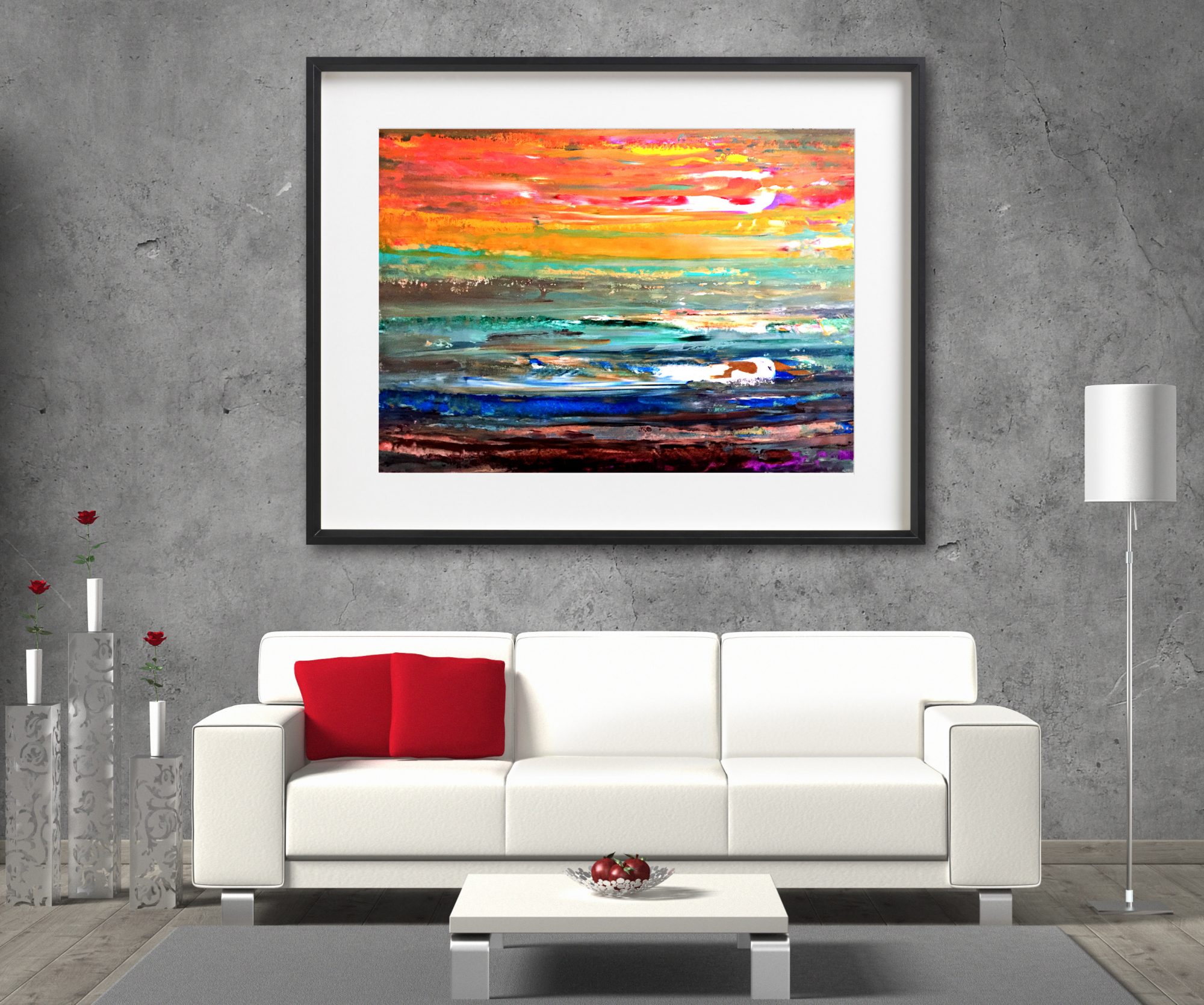In the photos, where the painting is shown mounted on a wall, these are purely for illustrative purposes. You should review the dimension of the artwork to be sure the work suits your needs. In the case when a painting is sold without a frame, of course, you can add a frame of your choosing and so it will add to the overall dimensions.