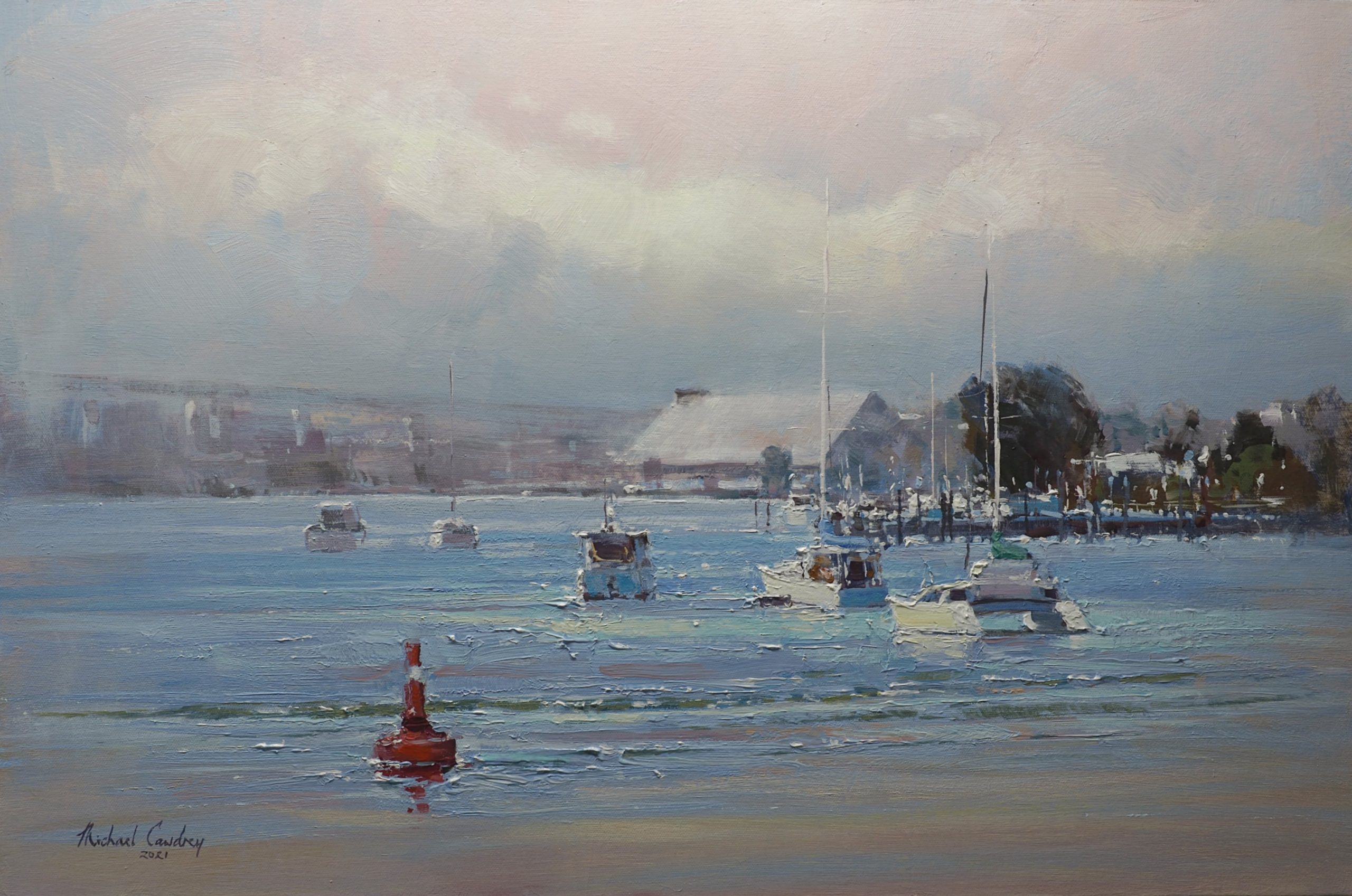 This original acrylic painting depicts a peaceful day on the Brisbane River, offshore from Newstead and Hamilton, with the southside suburb of Bulimba to the right. We are looking downstream towards the Gateway Bridges.