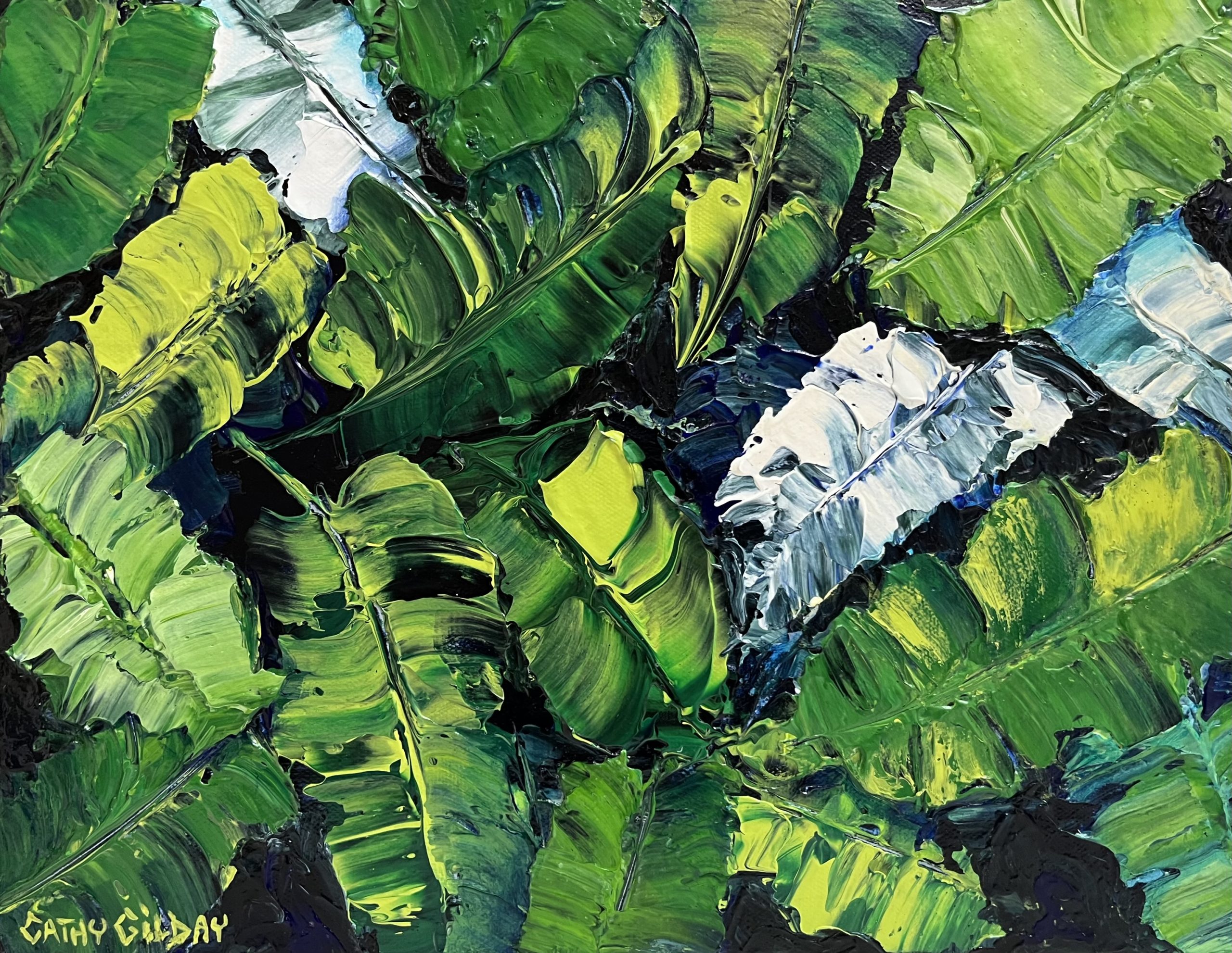 I have used palette knife application with heavy impasto paint, in this leafy green painting. The lovely buttery texture and various tones of variegated leaves, have contributed to the impression that this painting is bringing the garden indoors. Perhaps a great piece for someone who loves indoor plants but doesn’t have a green thumb;)