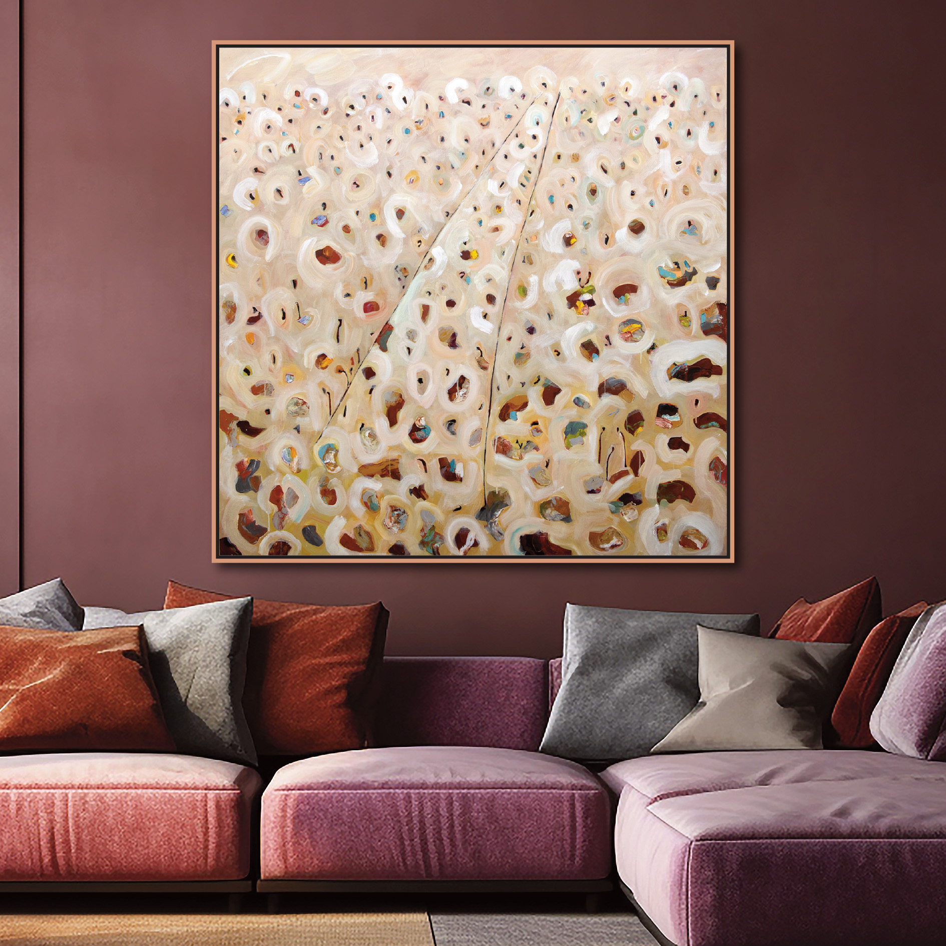 Leanganook, Day 9 by Michael Wolfe – 153x153cm framed in a thin line Mountain Ash frame in a natural Danish Oil finish. Available to view at Art Lovers Gallery, Melbourne.