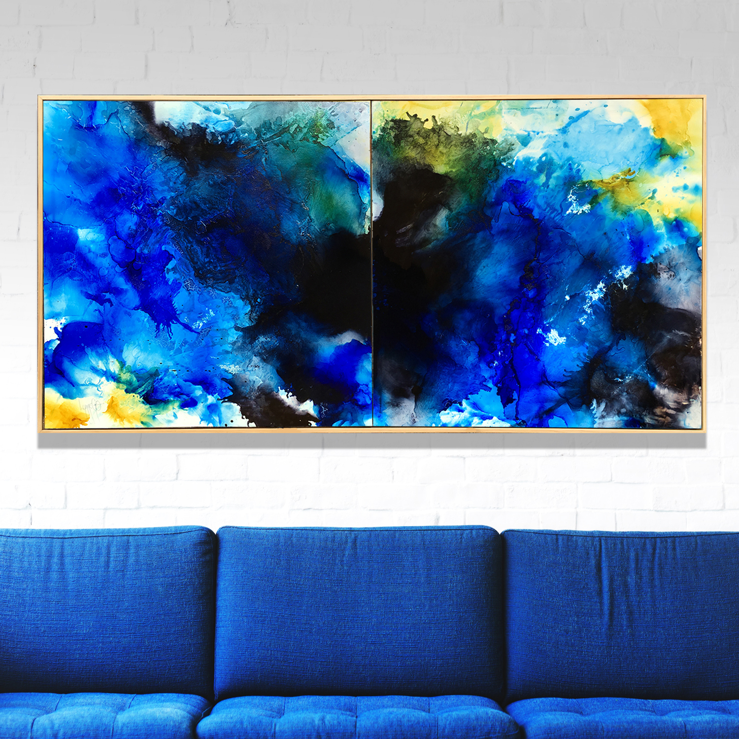 A beautiful, bold diptych housed in a custom made pine frame. Created with alcohol inks, this flowing abstract merges vibrant blues along with yellow and black.