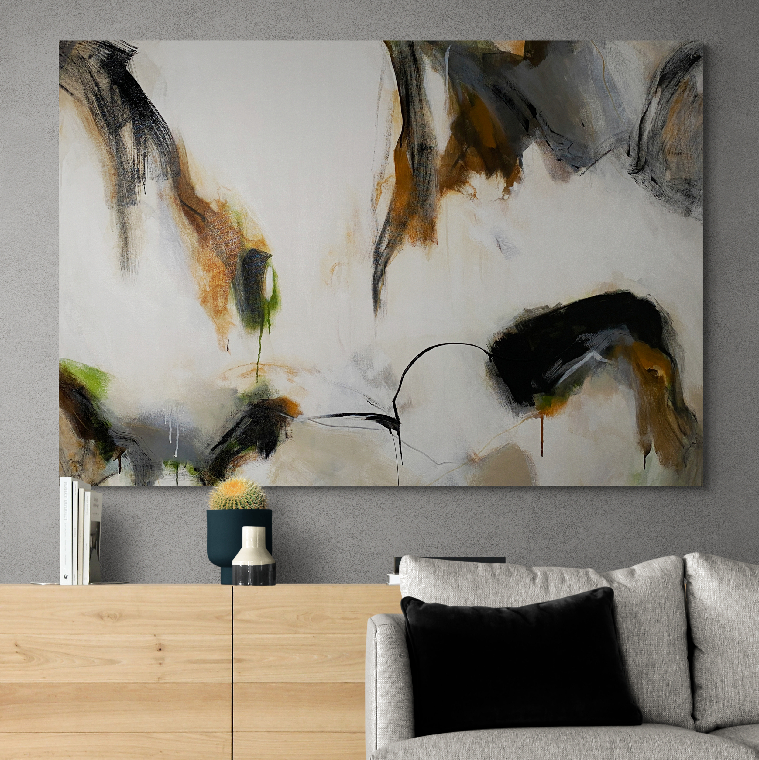 Its striking palette of light green mixed with rich ochre, beige, grey, and earthy tones ties together beautifully against areas of black and white which makes this piece come alive.