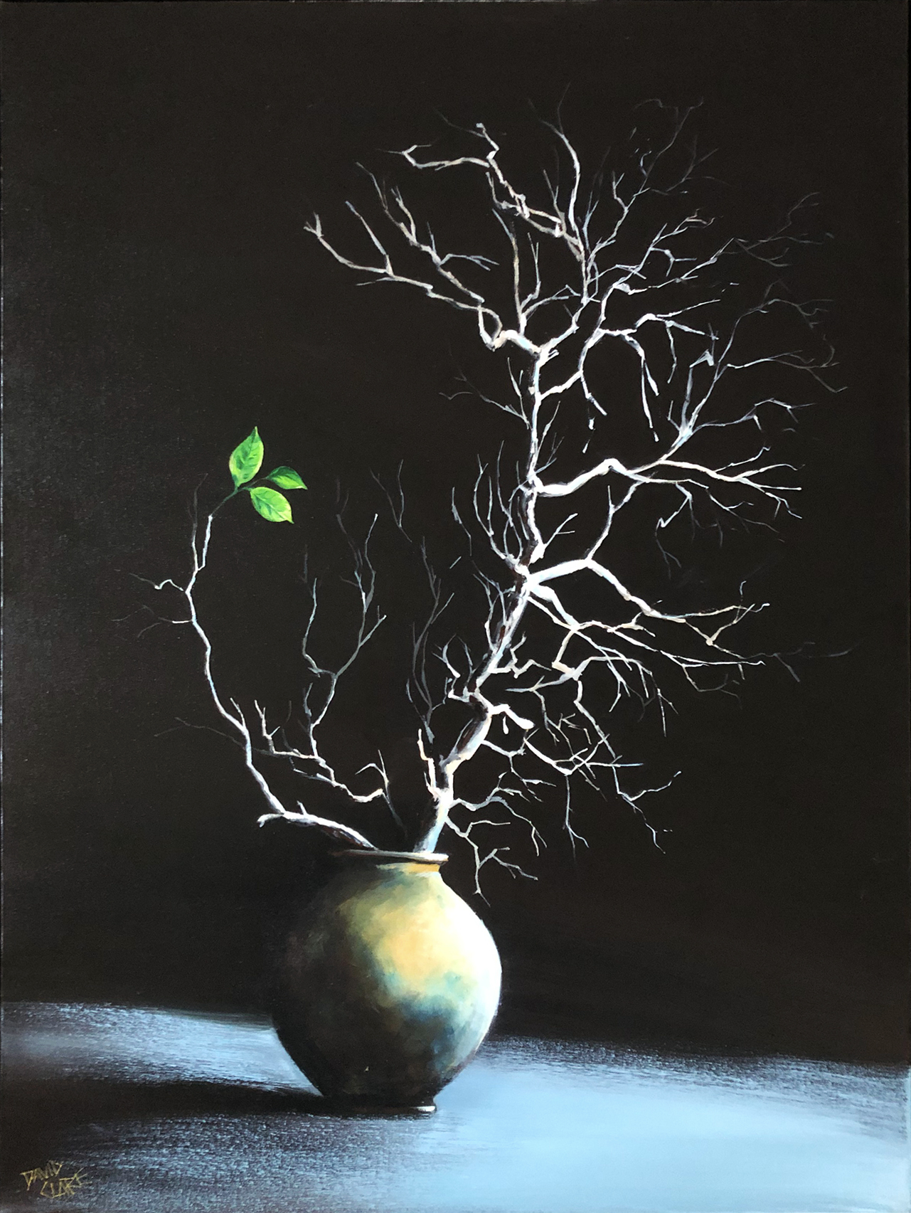 One of my current series of paintings depicting “Signs Of Life”. In this case, a seemingly dead tree in an old pot with some fresh, bright green leaves sprouting out of the darkness. A possible sign of things to come as we all hope for freedom after a difficult few years.