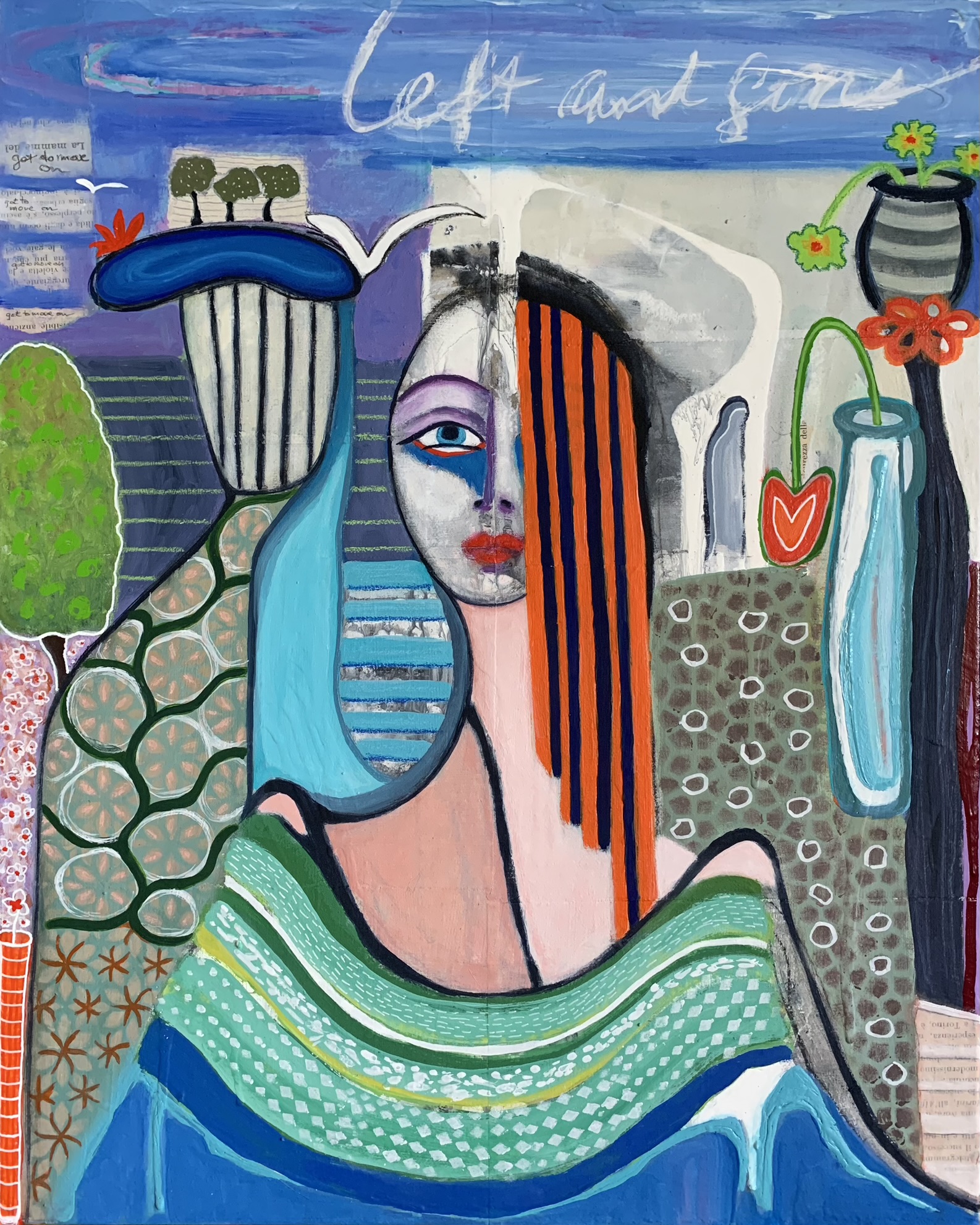 I used acrylic paint, different pens, pencils, oil pastel and collage from antique poetry books I bought at the antique market in Umbria, Italy. Signed on the back.