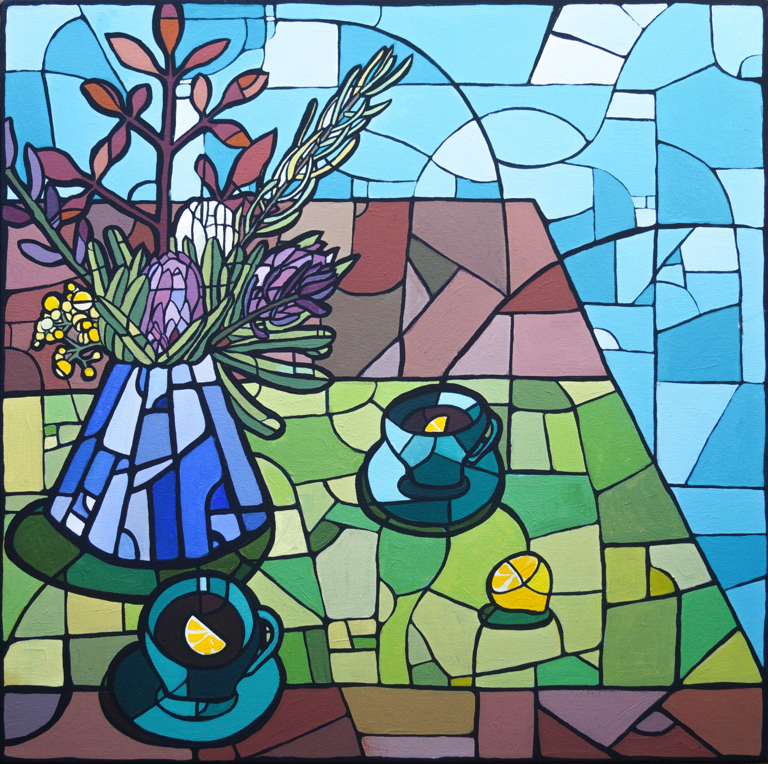 Lemon Tea is vibrant still life painted in a naive style of a table set with tea cups, lemon slices and a vase of proteas and wattle flowers.