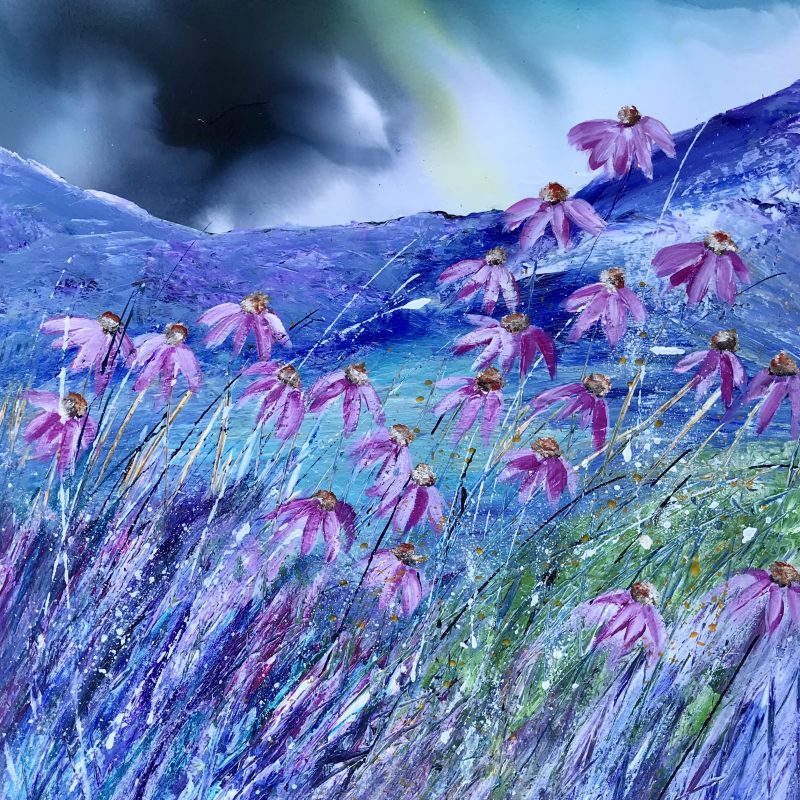 Lemon Tree Pathway by Estelle Asmodelle – The pathway to the lemon tree is a long winding path, through the trees and the overgown purple trailing Lantana. It is a reflective walk and one that someone does when they want to comtemplate life and one’s existence, so too it was painted with the same contemplation. Painted in the style of abstract expressionism.