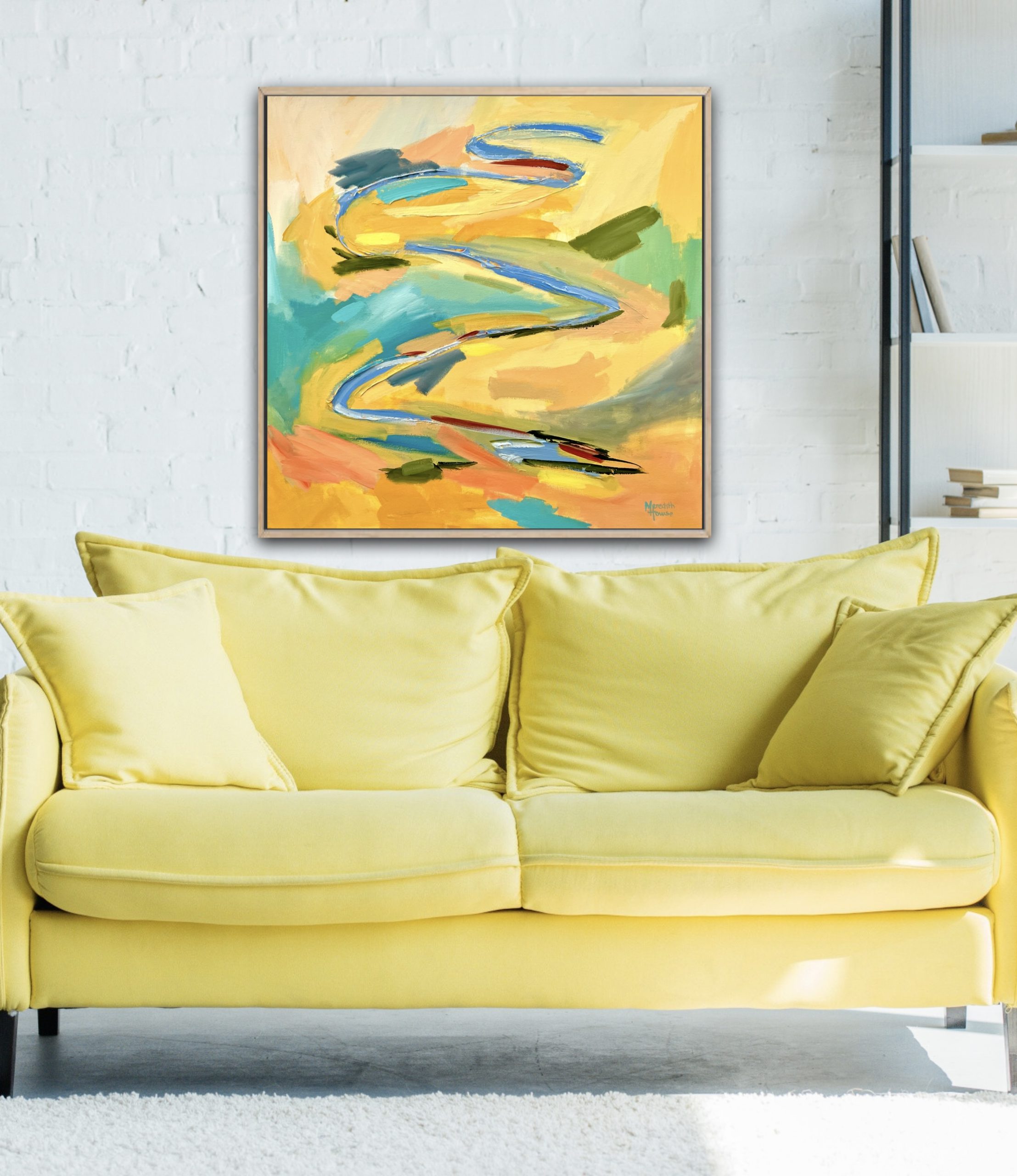 Abstract artwork in square format with vibrant use of yellow and green and greys with a splash of blue. Connection is made between colours and lines.