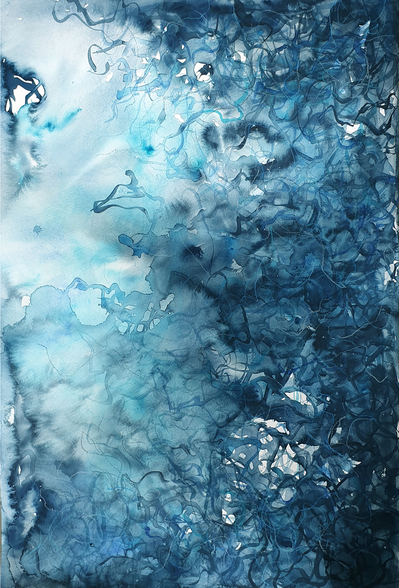 “In the Deep” by Leni Kae is an abstract seascape artwork by Sydney artist Leni Kae. The sea here is painted in watercolour with oil pastel highlights on 300gsm paper. Symbolic of diving in to deep emotions, allowing them to take over, be released; and discovering a new sense of self in the process. From Leni Kae’s series ‘Flowscapes’.