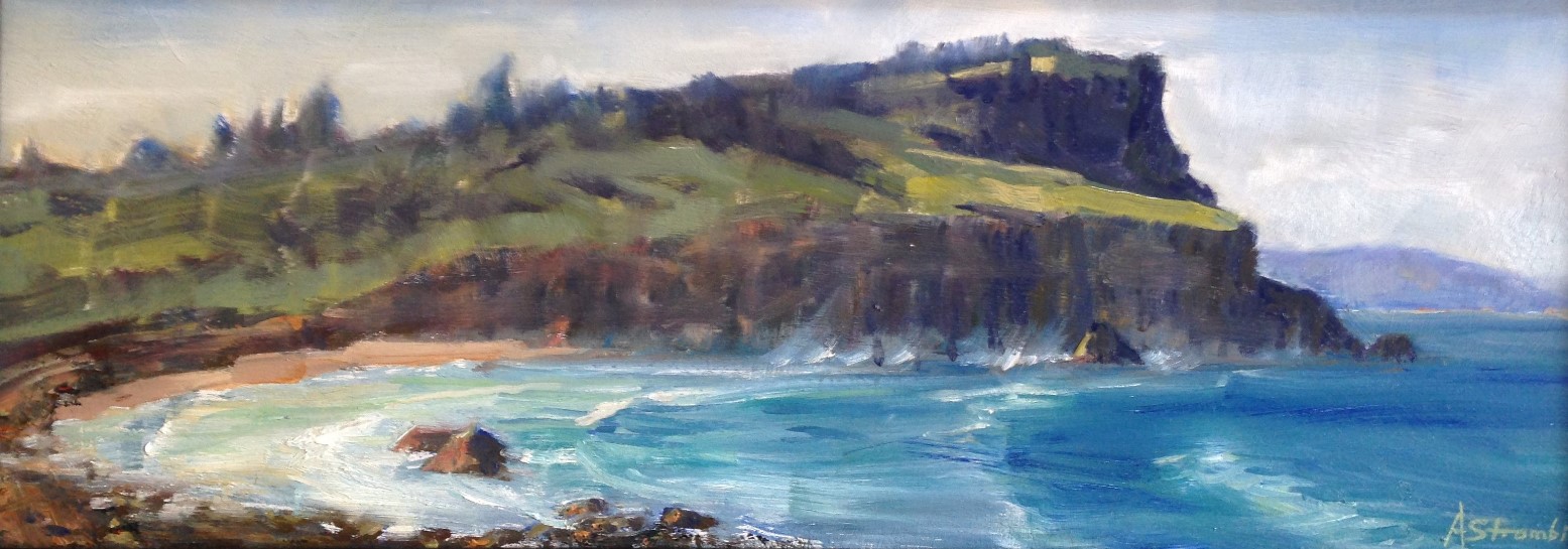Lennox Headland South, oil paint on sealed board, varnished, framed and ready to hang.