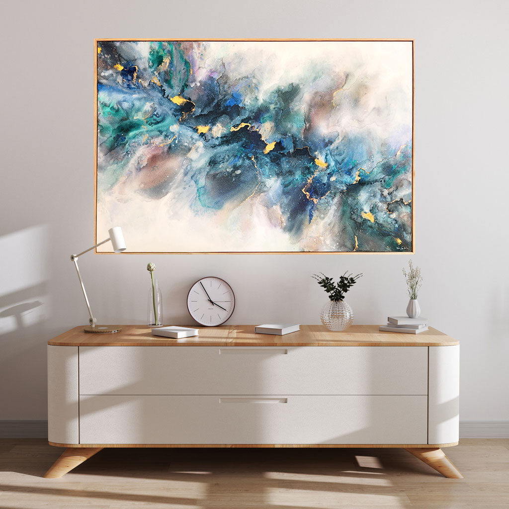 Throughout this dreamy original abstract piece, there is pure 24k gold leaf and metallic paints that shine in different lights throughout the day. Bringing the piece to life and giving it an extra special glimmer.