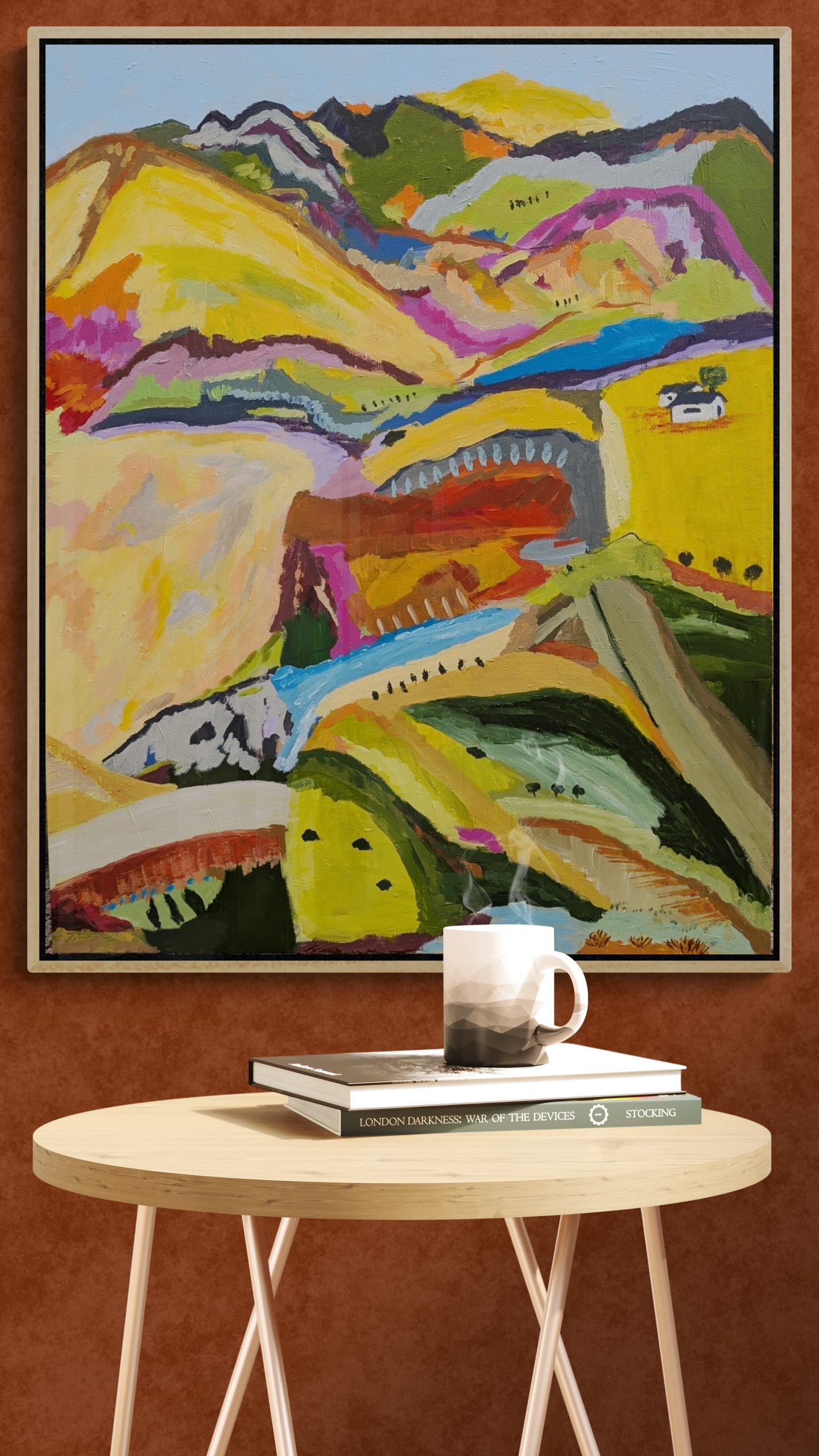 This abstract landscape painting is a heartfelt response to the raw, untamed beauty of the Australian terrain. Bold colours, unexpected forms, and layered textures reflect the diverse topography — from golden hills and winding rivers to distant ranges and scattered bushland.
