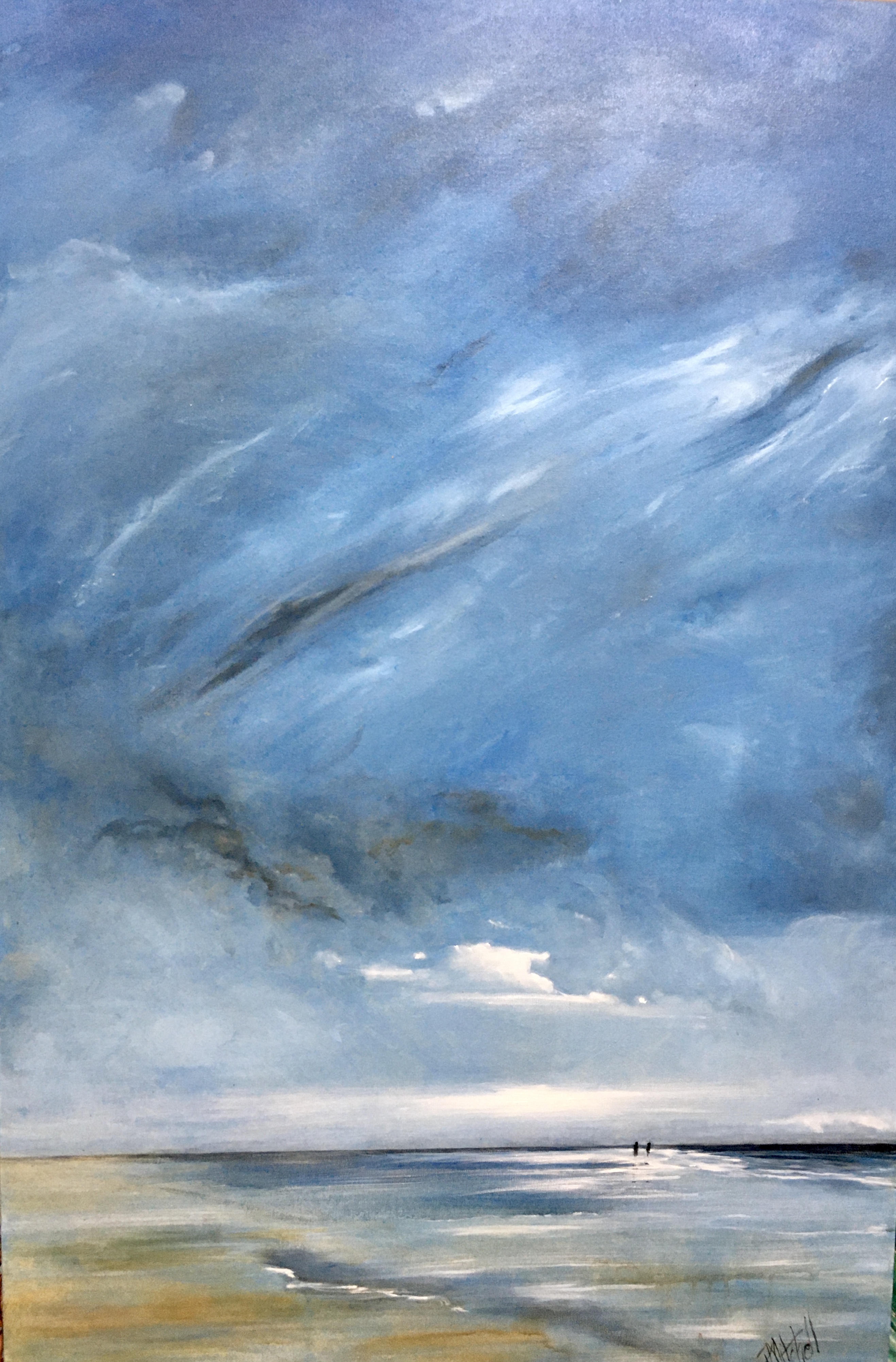 Let’s Walk is an original artwork inspired by walking the beach and watching the tide coming in. The sky seemed vast and never ending. Clouds were gathering and maybe a storm was brewing.  I imagined a couple walking in the shallows at early morn or late evening. What were they talking about?