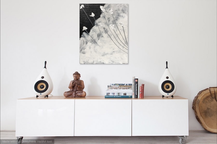 Acrylic paint and imitation silver leaf on a canvas board finished with gloss varnish
