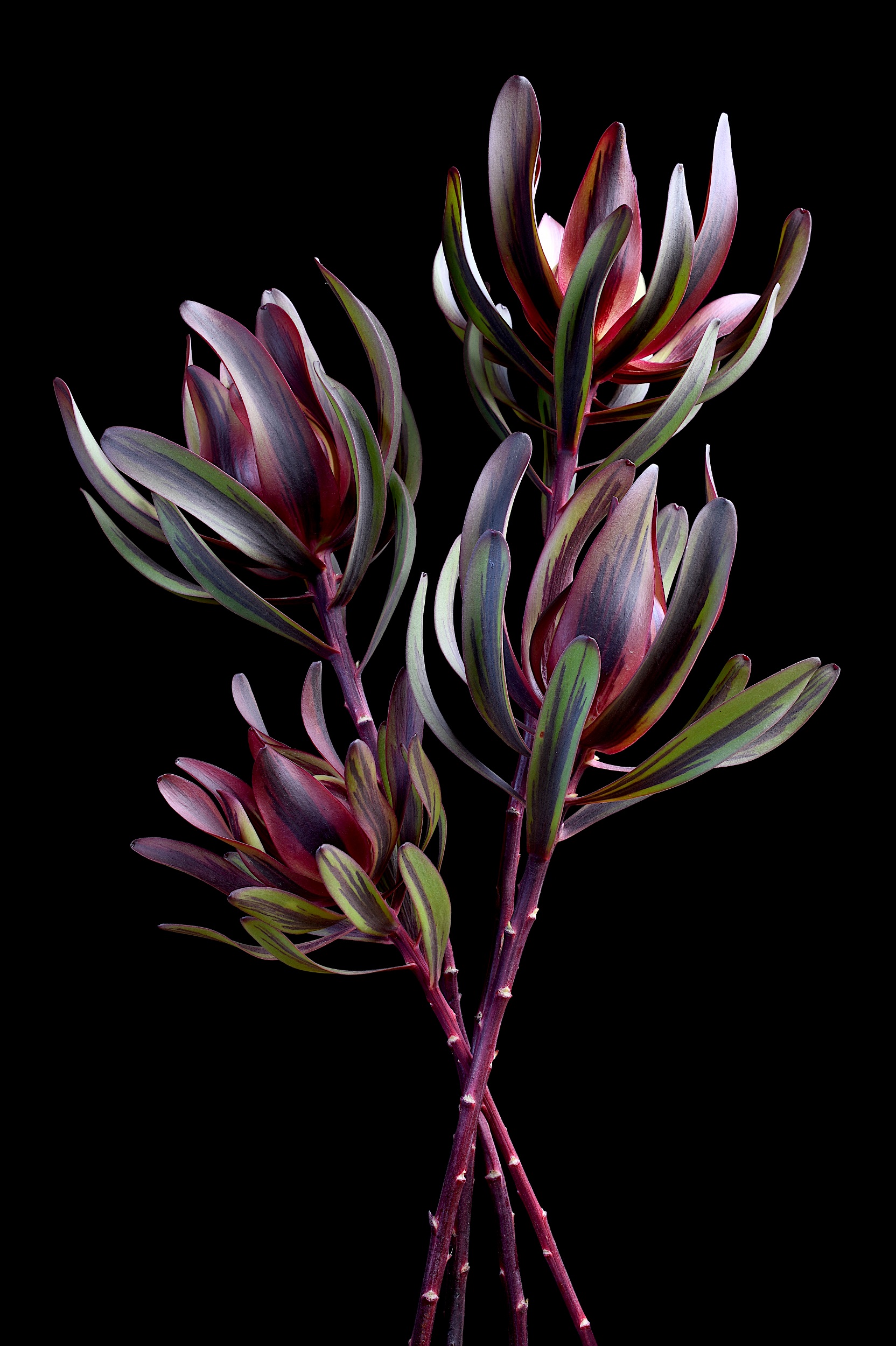 Structurally stunning, Burgundy Blaze Leucadendron flowers captured against a black background. Dramatic, dark and fiery.