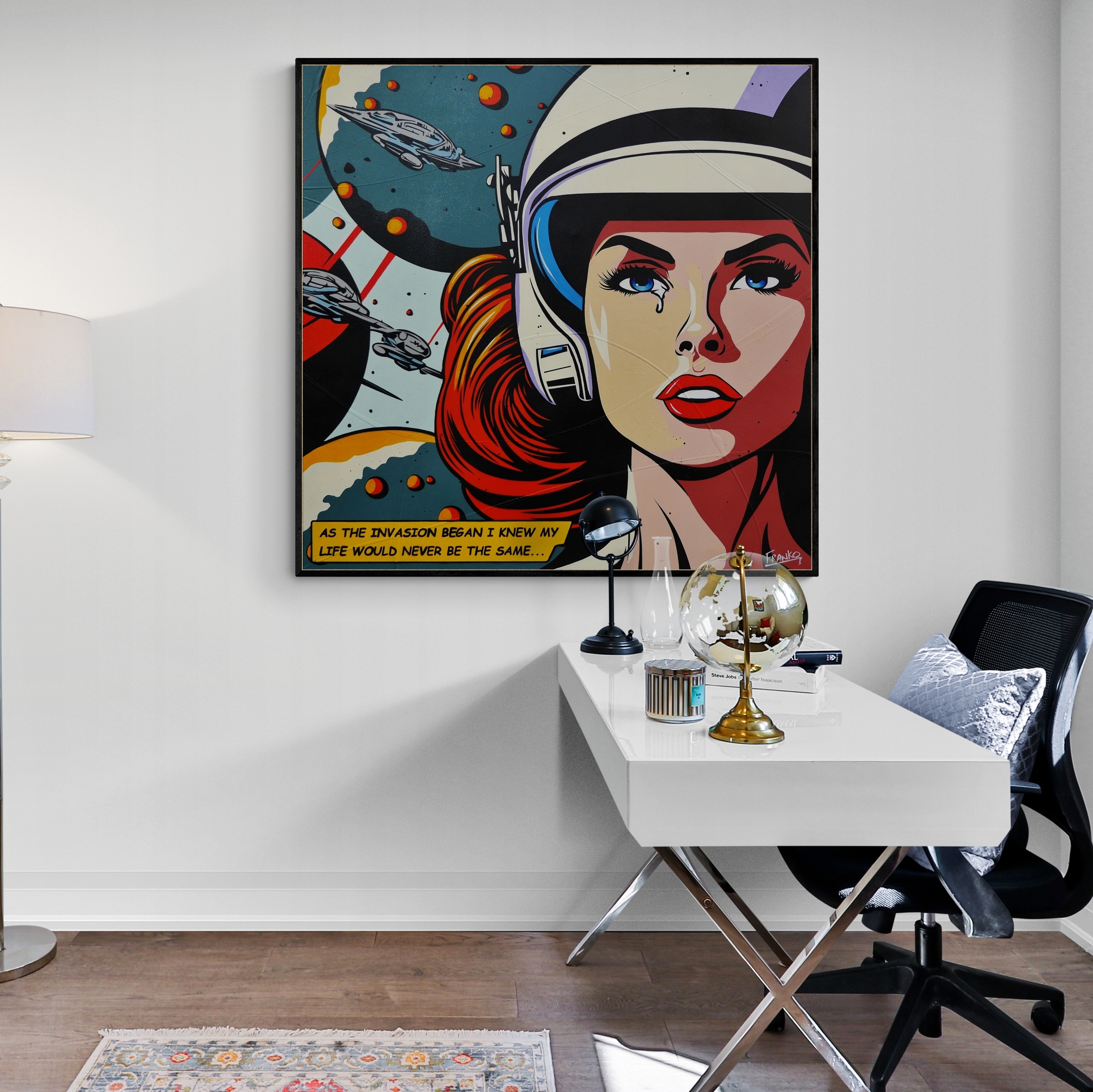 Ola spunky art lover! Thanks for checking out this funky piece… “Life.” This painting is the latest addition to our heroines series which is based around Space, (Retro and futuristic) WW2, Cowgirls and Japanese warriors (of the femme type)! Features orange, yellow, teal, blue, purple, skin tones, cream, red, white and black acrylics, inks and sugar sprays on a textured and layered canvas base!