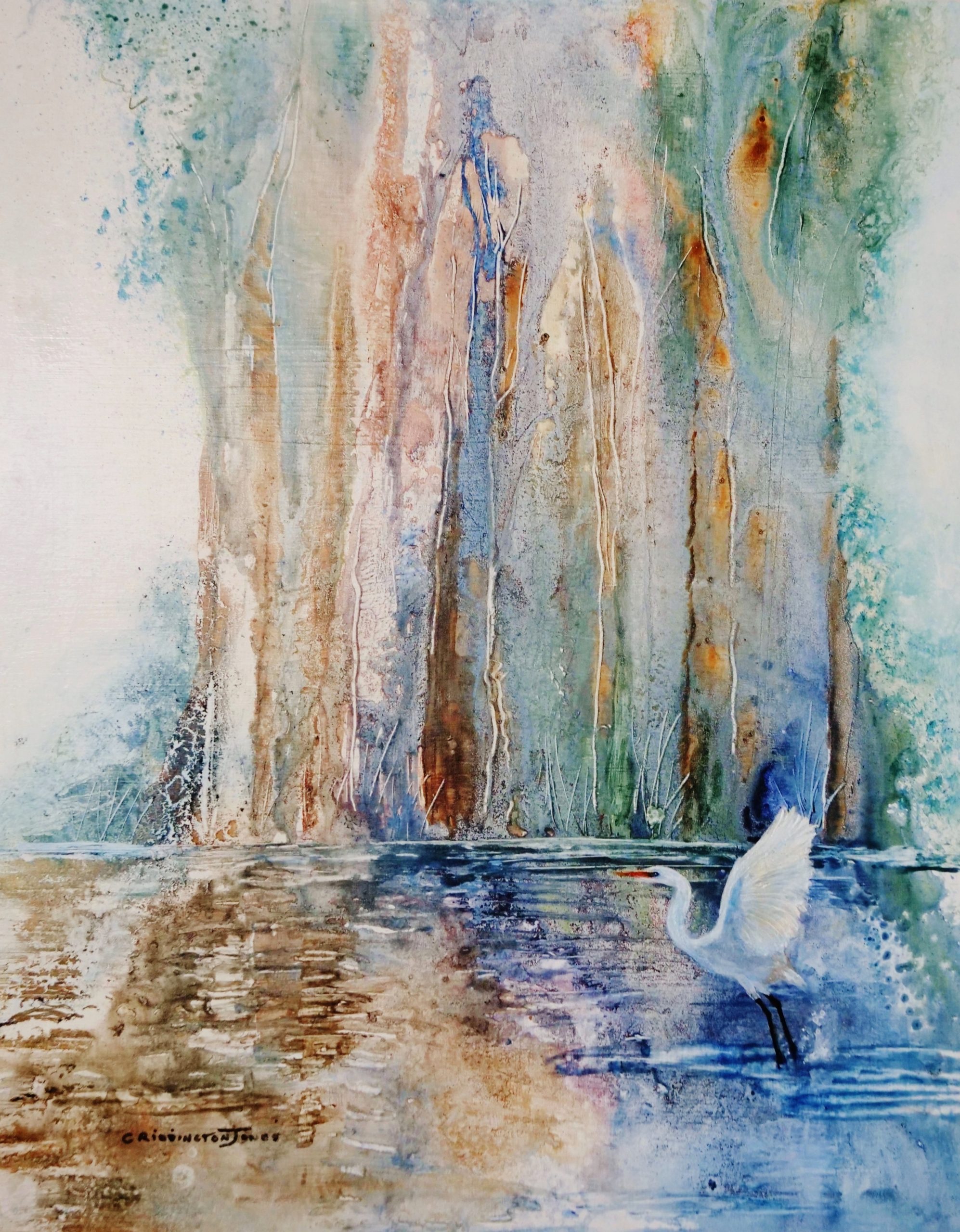 This serene landscape was inspired by my many trips up the Noosa River. The wading birds are always fishing in the river and it is a very peaceful experience to just sit and watch the wildlife and listen to the birds. The painting was done with many soft washes over a textured background and is a loose and expressive interpretation of life on the river. The sides have been left with the soft colour of the timber. It would have a very calming effect in any room. It could also be teamed with the other Life on the River paintings on this site to make a triptych.