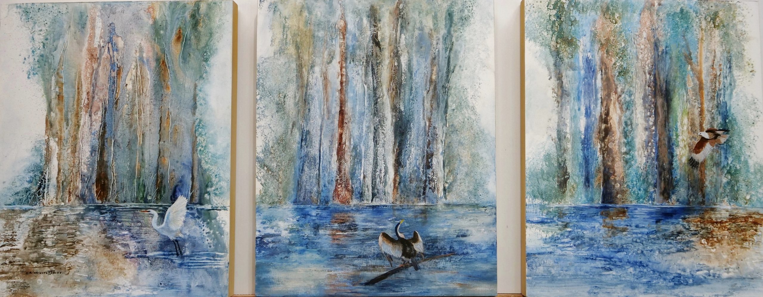 This serene landscape triptych was inspired by my many trips up the Noosa River. The wading birds are always fishing in the river and it is a very peaceful experience to just sit and watch the wildlife and listen to the birds. The story with these three paintings is that the Brahminy Kite flies out of the trees, the Darter watches cautiously and the Egret decides it’s not worth fishing while the Kite is around. The paintings were done with many soft washes over a textured background and they are a loose and expressive interpretation of life on the river. The sides have been left with the soft colour of the timber. The triptych would have a very calming effect in any room and would also suit a hallway. Each painting is also for sale separately. Each one measures 40cm x 50.5cm. Finished with three coats of archival varnish.