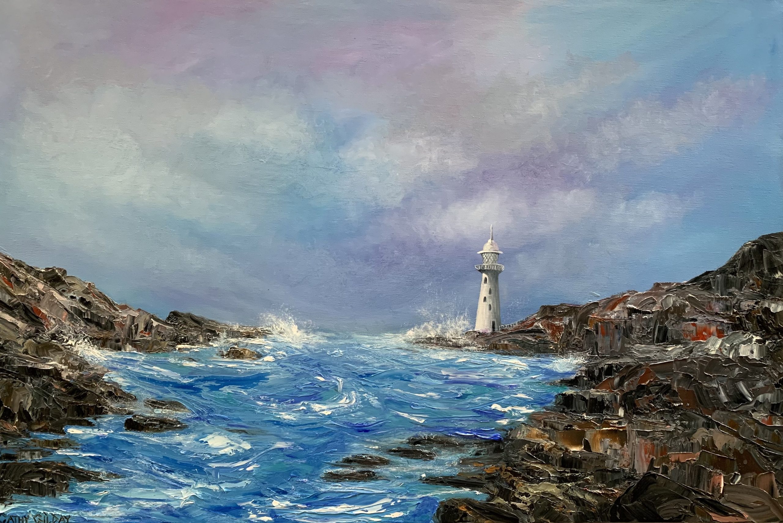 Inspired by a documentary series I’ve been watching, on lighthouses. I am in absolute awe of these incredible structures, how they were built and the part they have played in maritime history, worldwide. I was so fascinated with the keepers and the fact that they were able to commit to their life’s work, in such isolated and sometimes very solitary conditions. This work has some very heavy textures, with palette knife application. Sides painted & sealed.