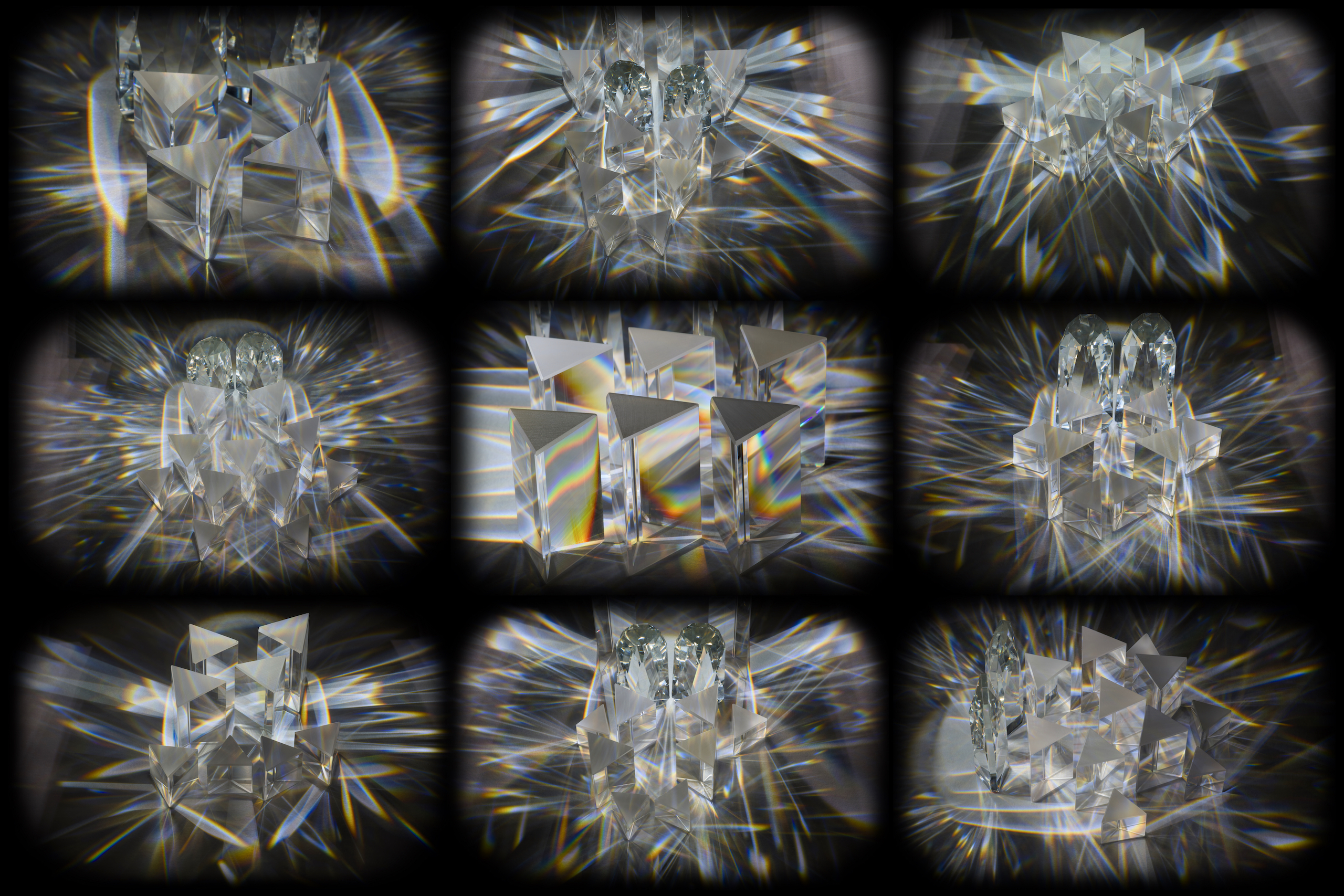 To celebrate becoming a new Art Lovers Australia artist, PLAYlogo has created this very special super sized collage of high resolution photos from his “Prism City” light art photography series. At an incredible 23700 × 15800 resolution, the collage has been specially prepared for printing at larger sizes. Each photo features beautiful light fans and spectra created by prisms and ornamental crystals. The background material for each photo has a slight texture that catches the spectral colours nicely.